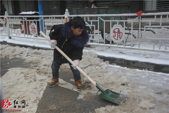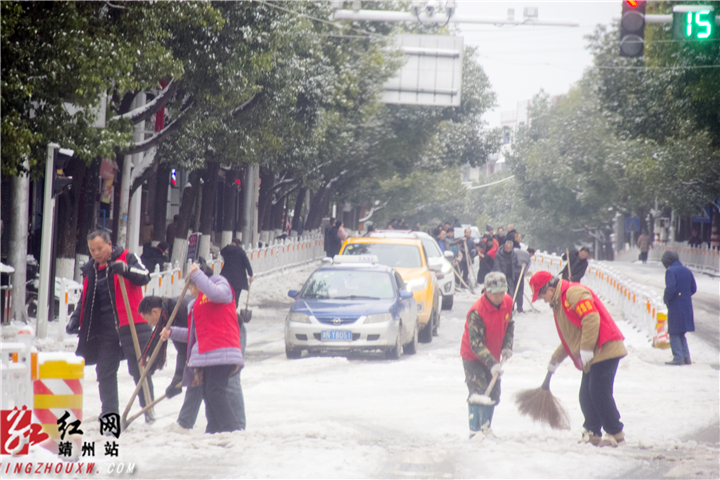 12月31日,靖州县渠阳镇四鼓楼十字路口的两侧人行道上,身穿红马甲,头戴小红帽的志愿者,正在铲除路面冰雪,他们弯着腰,握着扫把铁锹……忙碌的身影成了严寒中一道亮丽的风景线。(邹家旺)