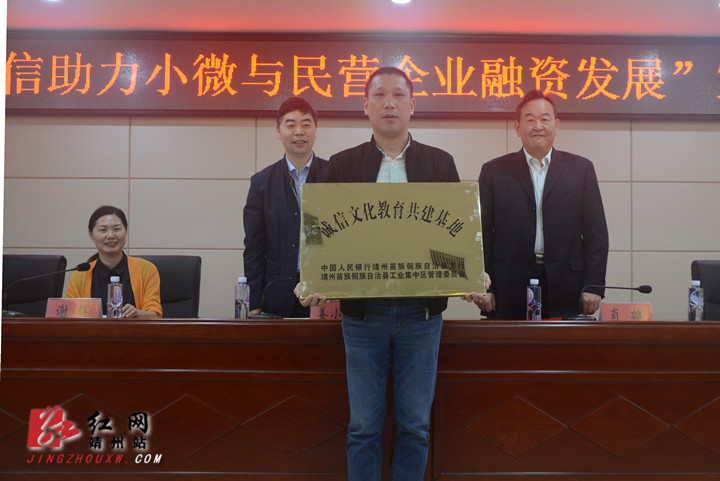 启动仪式上,中国人民银行怀化市中心支行征信管理科科长廖恒富宣读了《怀化市“征信助力小微与民营企业融资发展”专题宣传方案》。靖州县委常委、常务副县长姜小华,中国人民银行怀化市中心支行副行长肖雄,对靖州工业集中区“诚信文化教育共建基地”授牌。