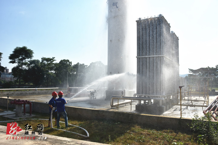 发生泄漏后,人员对泄漏周围设备进行喷淋降温,避免事故危极到周围设施 周悦伊 摄