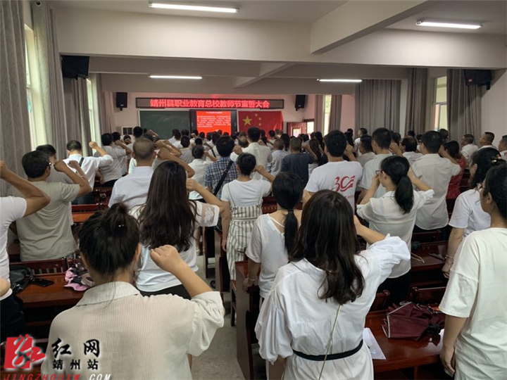 靖州新闻网·红网靖州站9月1日讯(通讯员 周永红)“我志愿从事党的教育事业……”9月10日清晨,朗朗的宣誓声音从靖州职中的会议室传出,这是该校170名教师在面对国旗和《中小学教师宣誓誓词》进行庄严的宣誓活动。随后,学校将《习近平新时代中国特色社会主义思想学习纲要》和《教师的国学素养》两本书作为教师节礼物,赠送给每位教师,新意油然而生