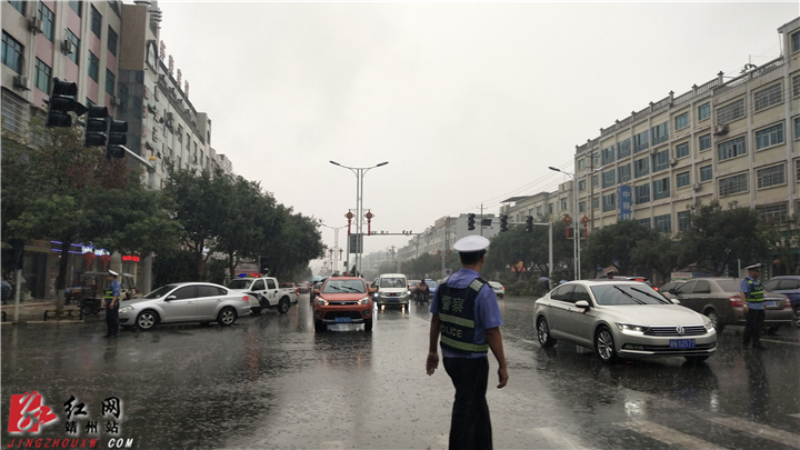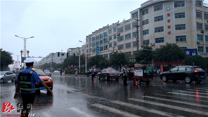 暴雨期间,靖州交管中心派驻该路段的执勤交警坚守在工作岗位上,及时进行路口疏导指挥,防止交通拥堵现象发生。到17时交通信号灯关闭后,由于雨越下越大,他们主动延长执勤时间。全体执勤民警充分发扬风雨无阻,连续作战的优良作风,顶风冒雨坚守岗位,站在路口中间指挥过往车辆和行人有序通行。提醒过往车辆速减速慢行,杜绝交通违法陋习,防止因雨天路滑和争先抢道引发道路交通事故和拥堵。