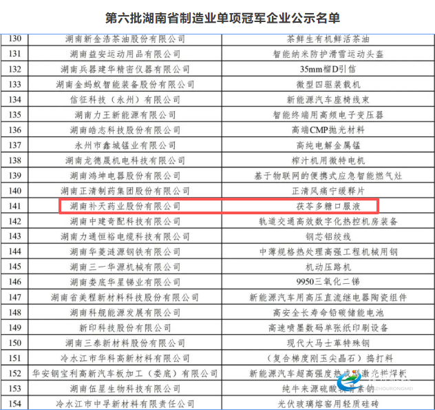 湖南补天药业股份有限公司凭借核心产品茯苓多糖口服液成功入选第六批省级制造业单项冠军企业(资料图)