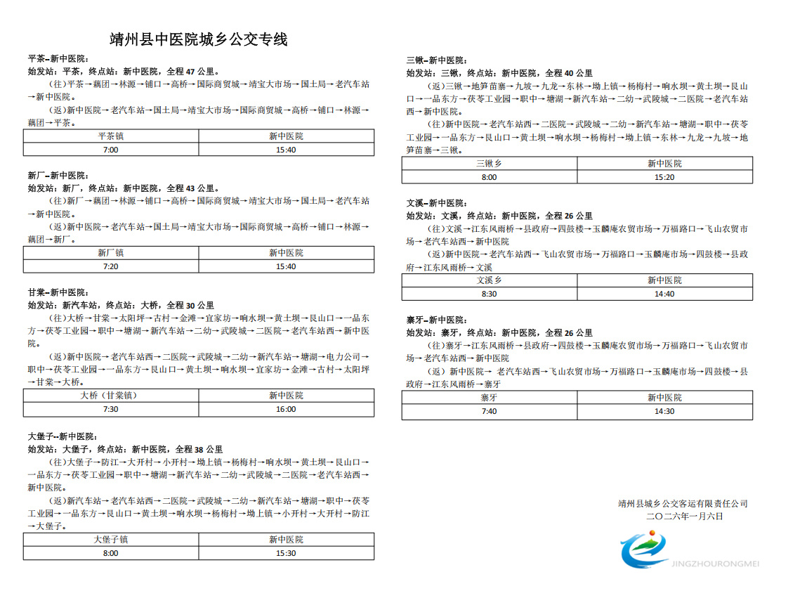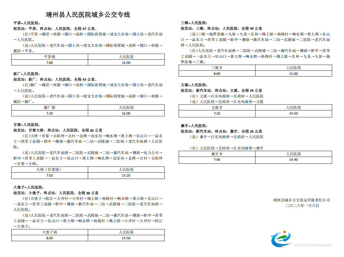 靖州融媒1月8日讯(记者 张秦 实习记者 刘昊 通讯员 熊勇)1月7日,靖州苗族侗族自治县城乡公交客运有限责任公司正式开通县人民医院、县中医医院两条城乡公交医疗专线,线路覆盖平茶、新厂、甘棠、大堡子、三锹、文溪、寨牙7个乡镇,精准破解乡镇群众“就医出行难”问题。
