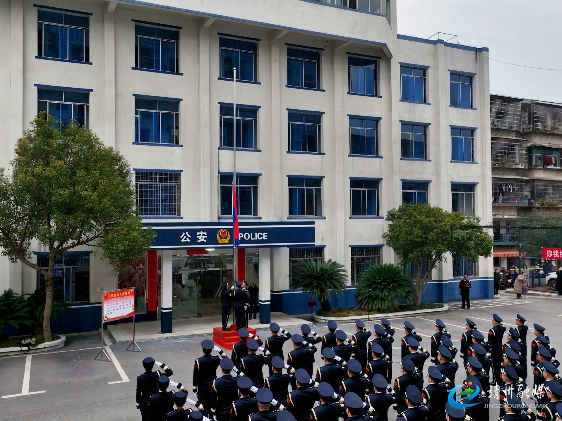 仪式现场,指挥员下达指令后,护旗队员身着警礼服,迈着铿锵步伐护卫警旗走向升旗台。雄壮的《中国人民警察警歌》奏响,警旗冉冉升起,全体民警警容严整、身姿挺拔,面向警旗庄严敬礼。随后,全体民警高举右拳重温入警誓词,嘹亮誓言响彻现场。