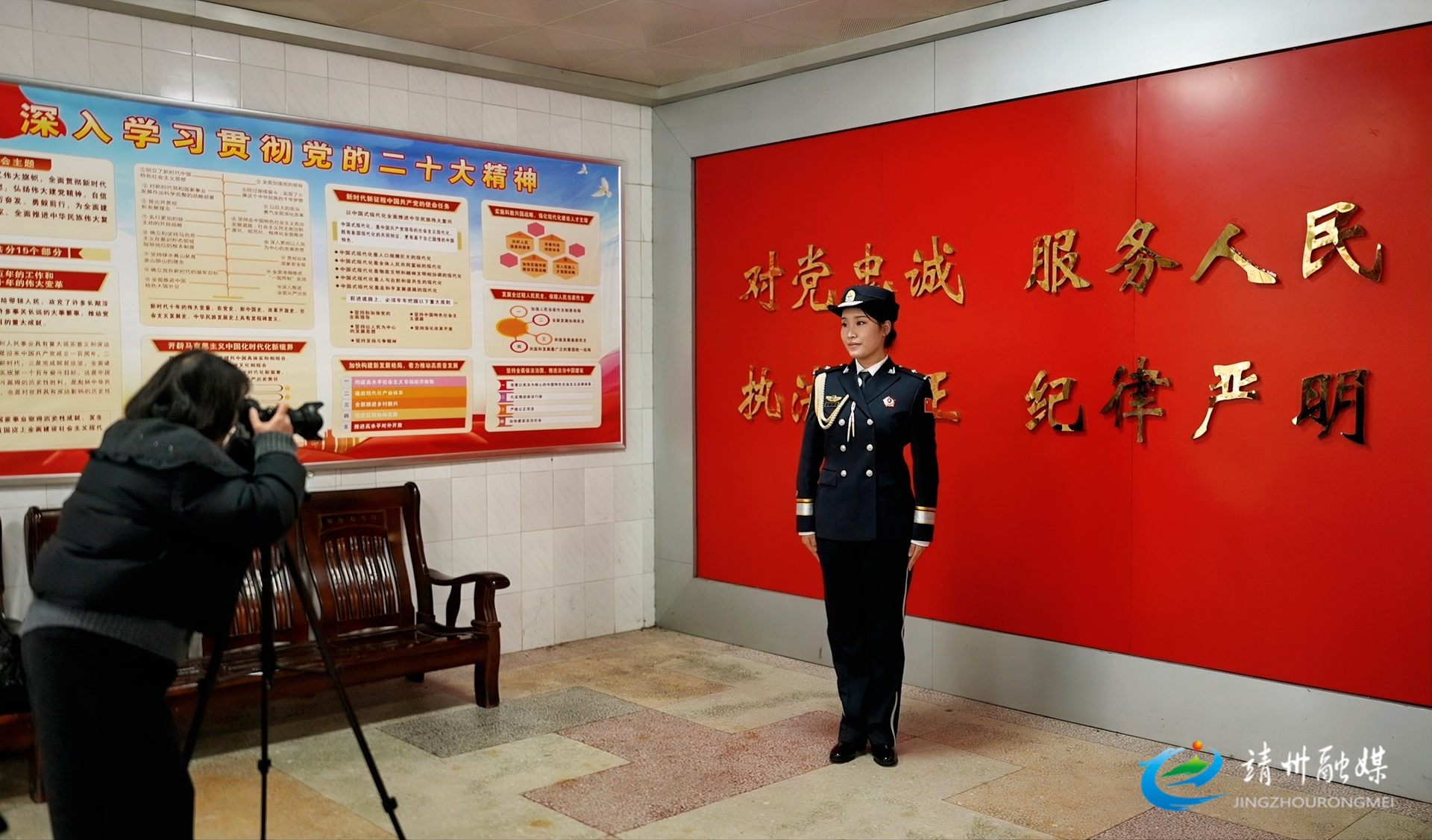 警员在十六字方针前定格专属的从警荣耀时刻(钦苏芬 摄)