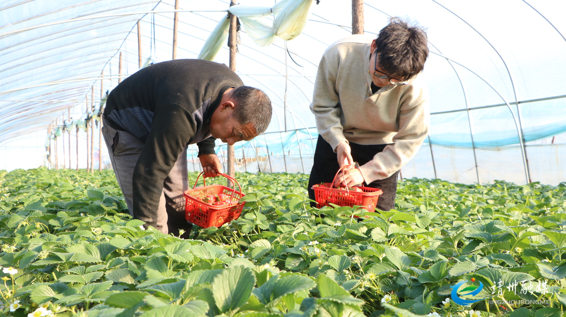 果农唐丰和父亲一起采摘草莓(夏源懋 摄)