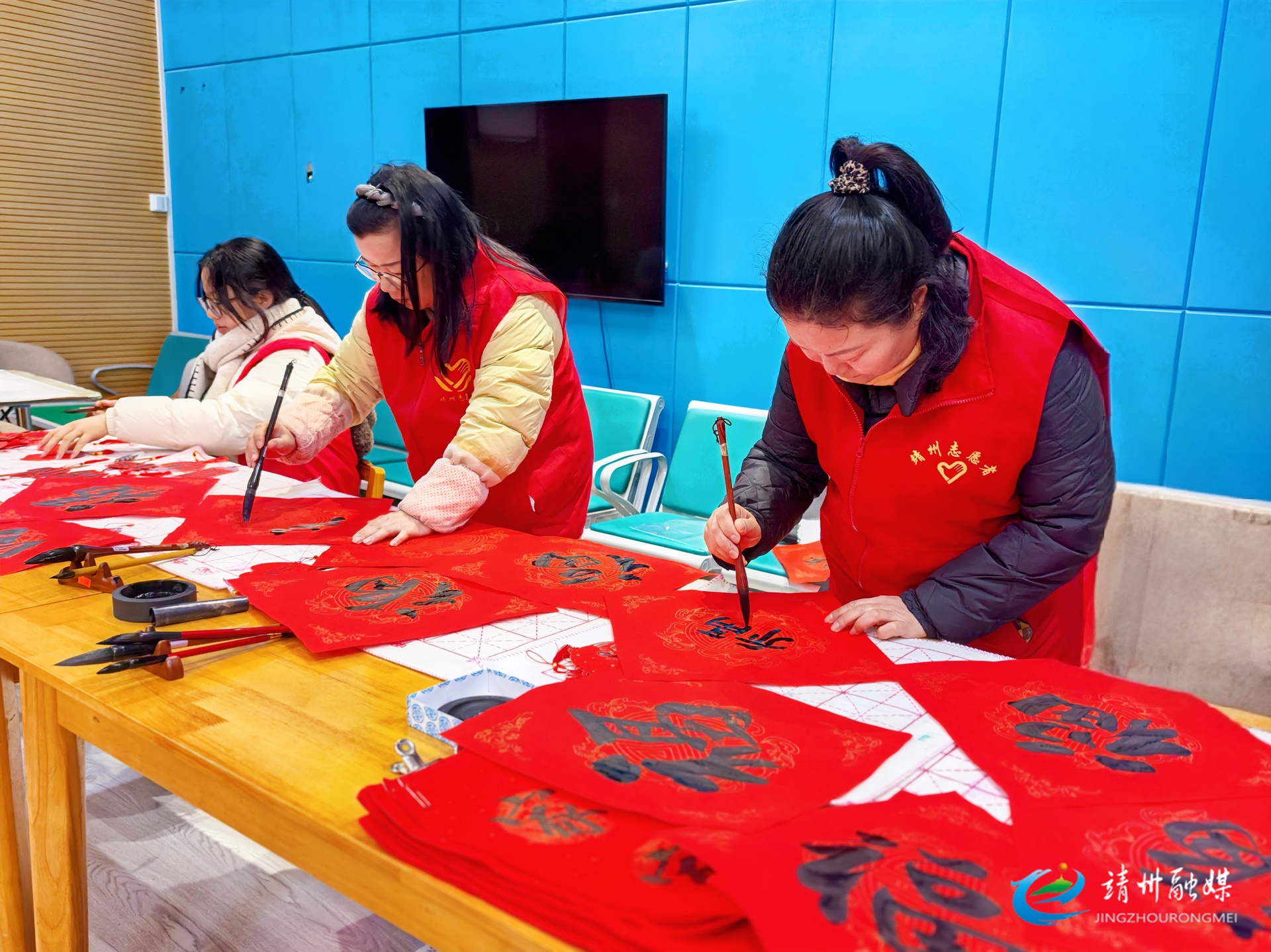 志愿者正在现场写“福”字(钦苏芬 摄)