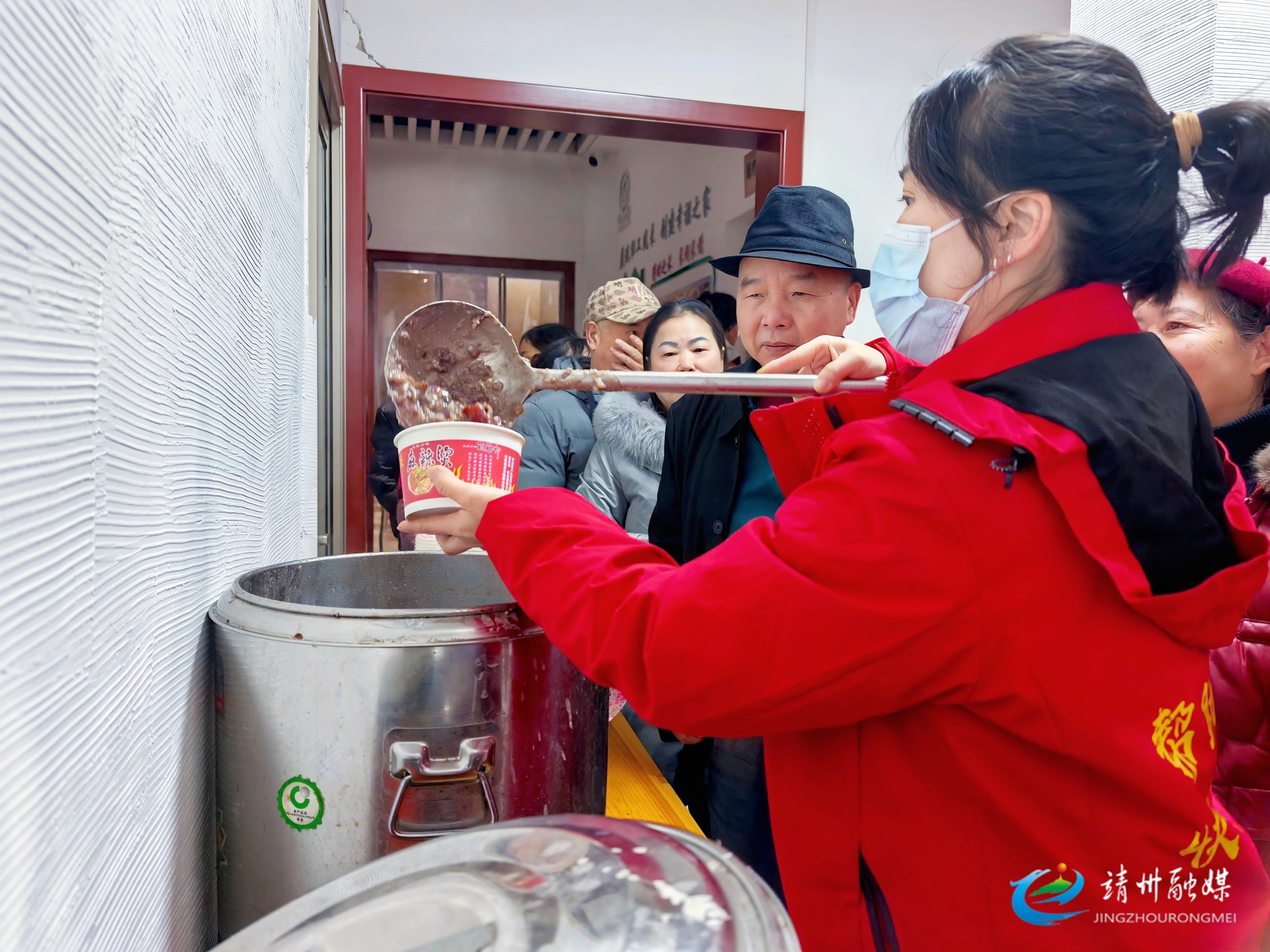 志愿者正在给排队的老人盛腊八粥(钦苏芬 摄)
