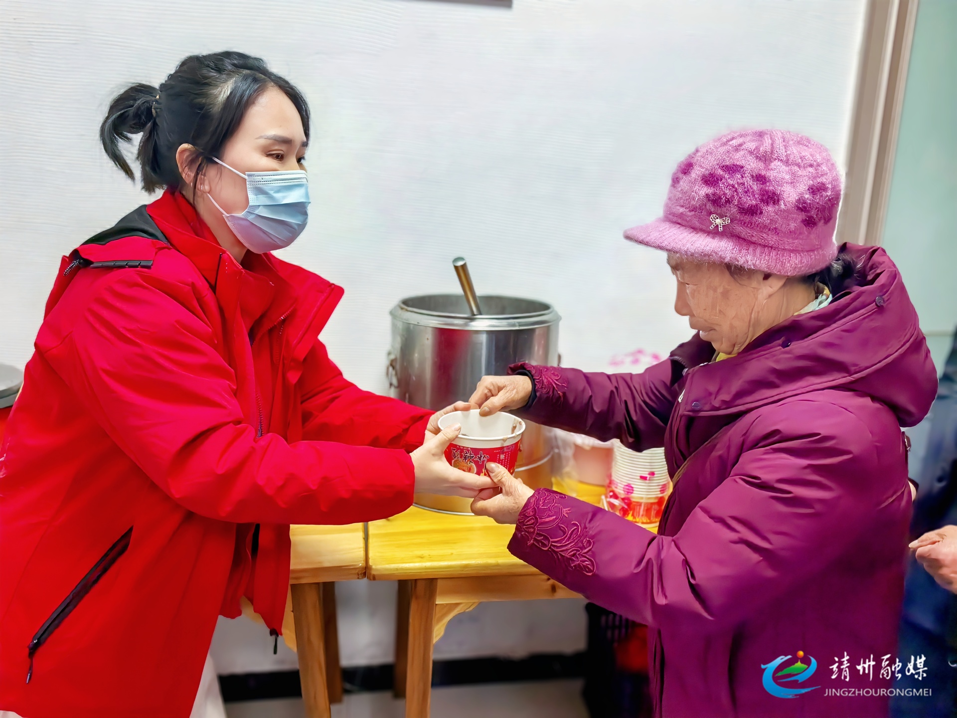 志愿者为老人送上腊八粥(钦苏芬 摄)