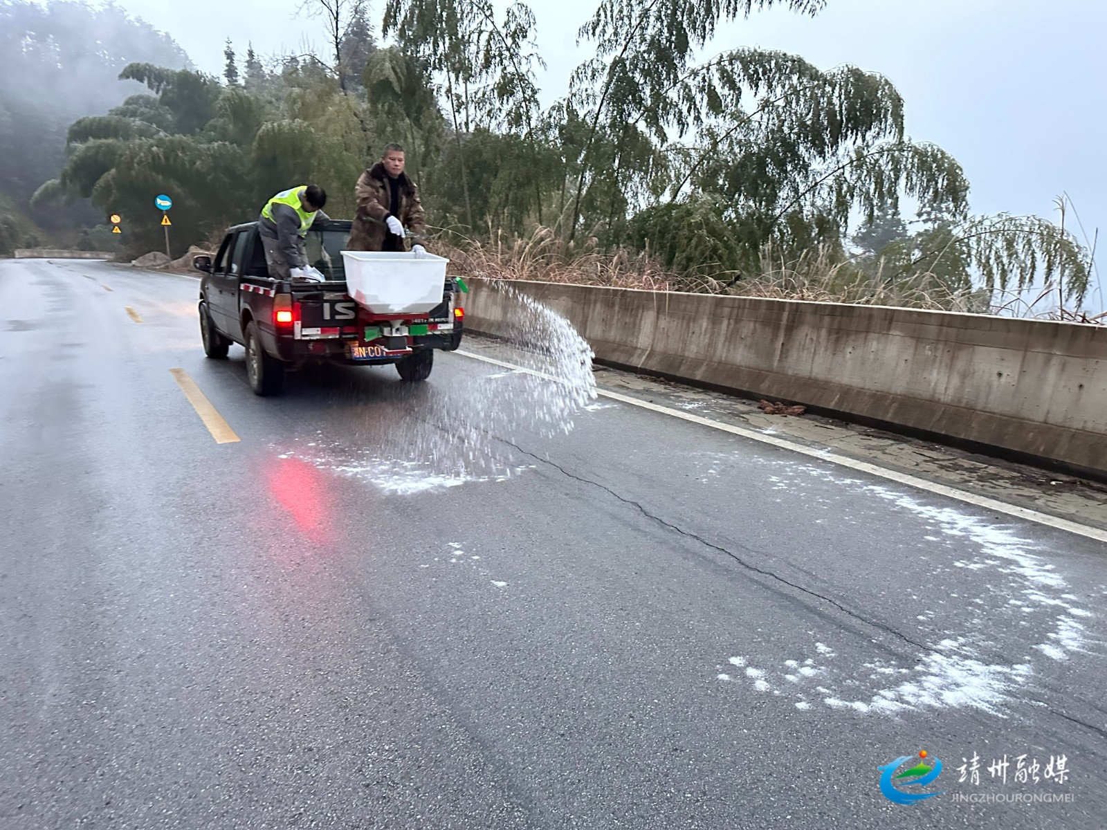 工作人员用撒盐机进行除冰作业 (宋强 摄)