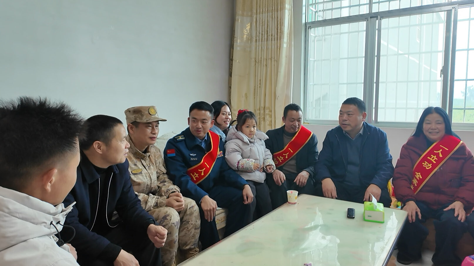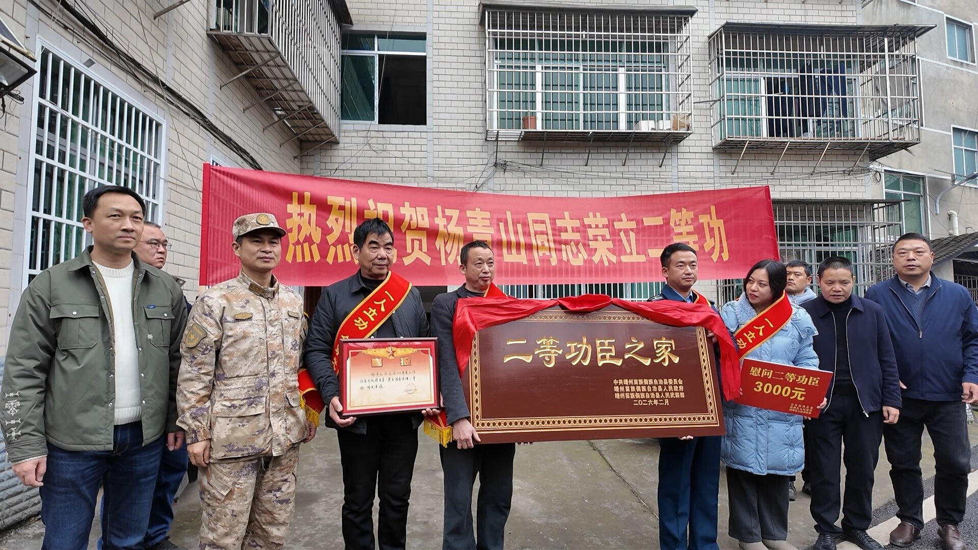送喜报队伍锣鼓喧天、步履庄重,“热烈祝贺杨青山同志荣立二等功”的横幅格外醒目,沿途群众纷纷驻足围观、拍照留念,共同见证这份属于军人家庭的荣耀。抵达杨青山家中后,工作人员郑重将立功喜报、“二等功臣之家”牌匾递交家属,并为其披上“一人立功 全家光荣”荣誉绶带,向立功军人及全家致以热烈祝贺。交流中,工作人员详细询问家属日常起居与身体健康状况,认真倾听生活诉求,叮嘱家属遇到困难及时反映,切实解除军人后顾之忧,让其在部队安心服役、再立新功。