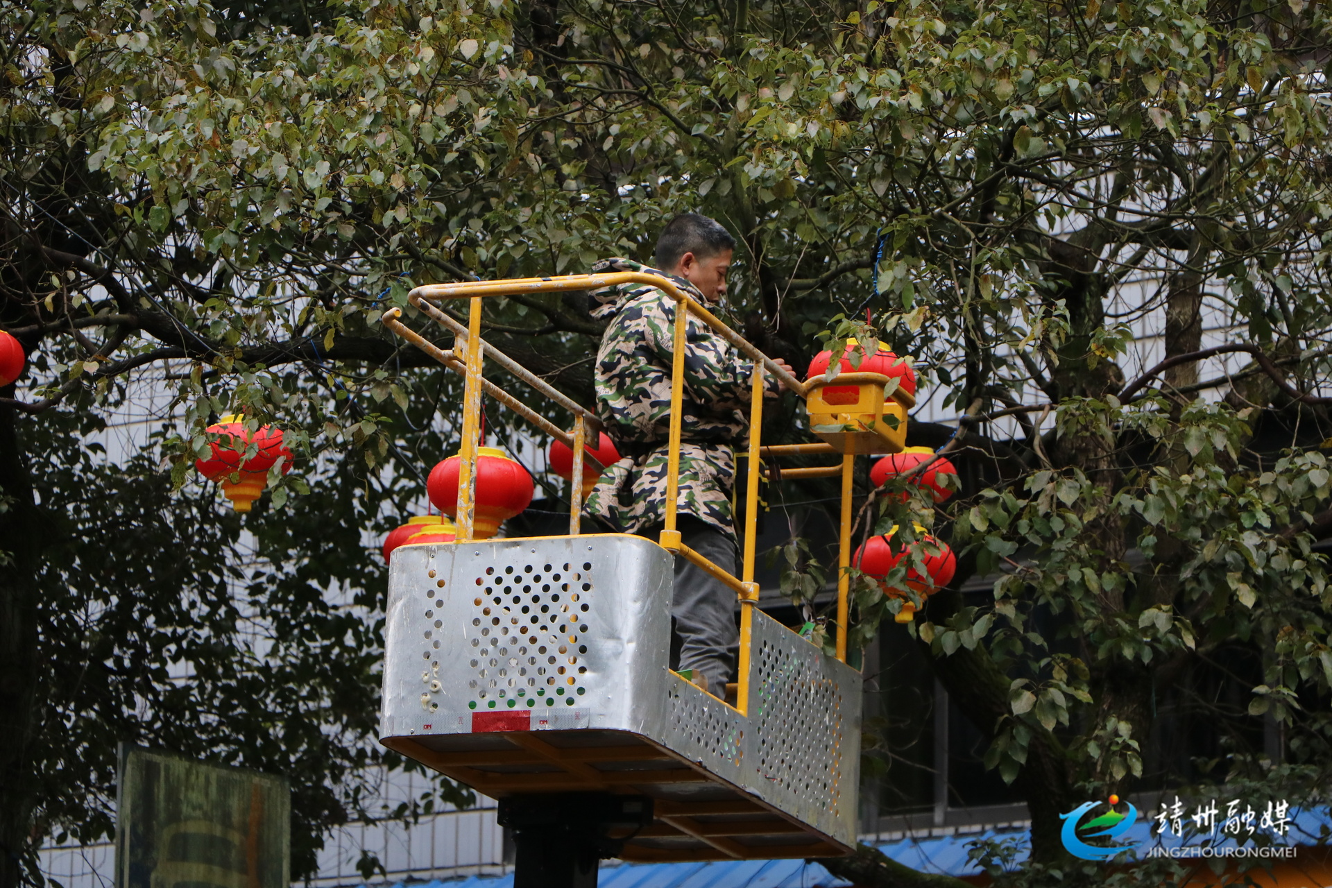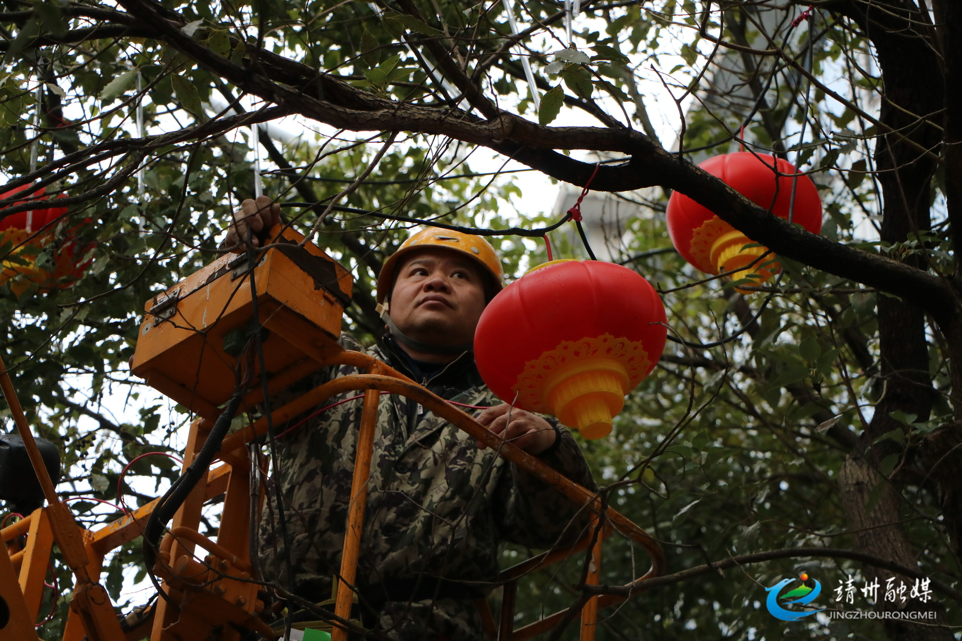 工人正在给树木挂上红灯笼和氛围灯(夏源懋 摄)
