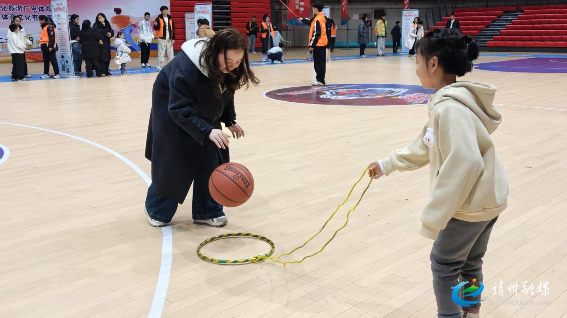 活动现场热闹非凡,“滚铁环”“袋鼠跳”“蚂蚁运球”等集体趣味项目前排起长龙,大人与孩子手拉手、肩并肩,默契配合完成接力挑战,争相赢取心仪奖品,加油声、欢呼声在场馆内此起彼伏。红色的运动道具与喜庆的新春装饰相互映衬,往来人群穿梭其间,勾勒出新春佳节热闹温馨的美好画面。