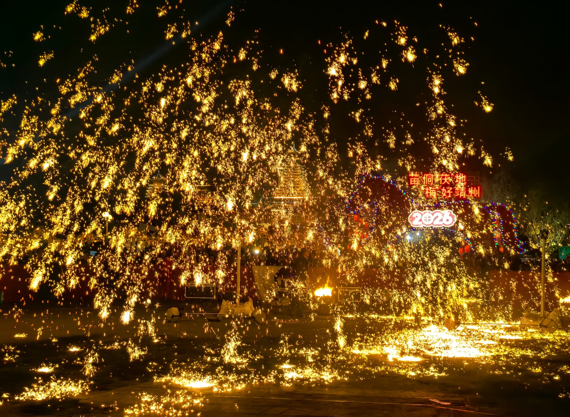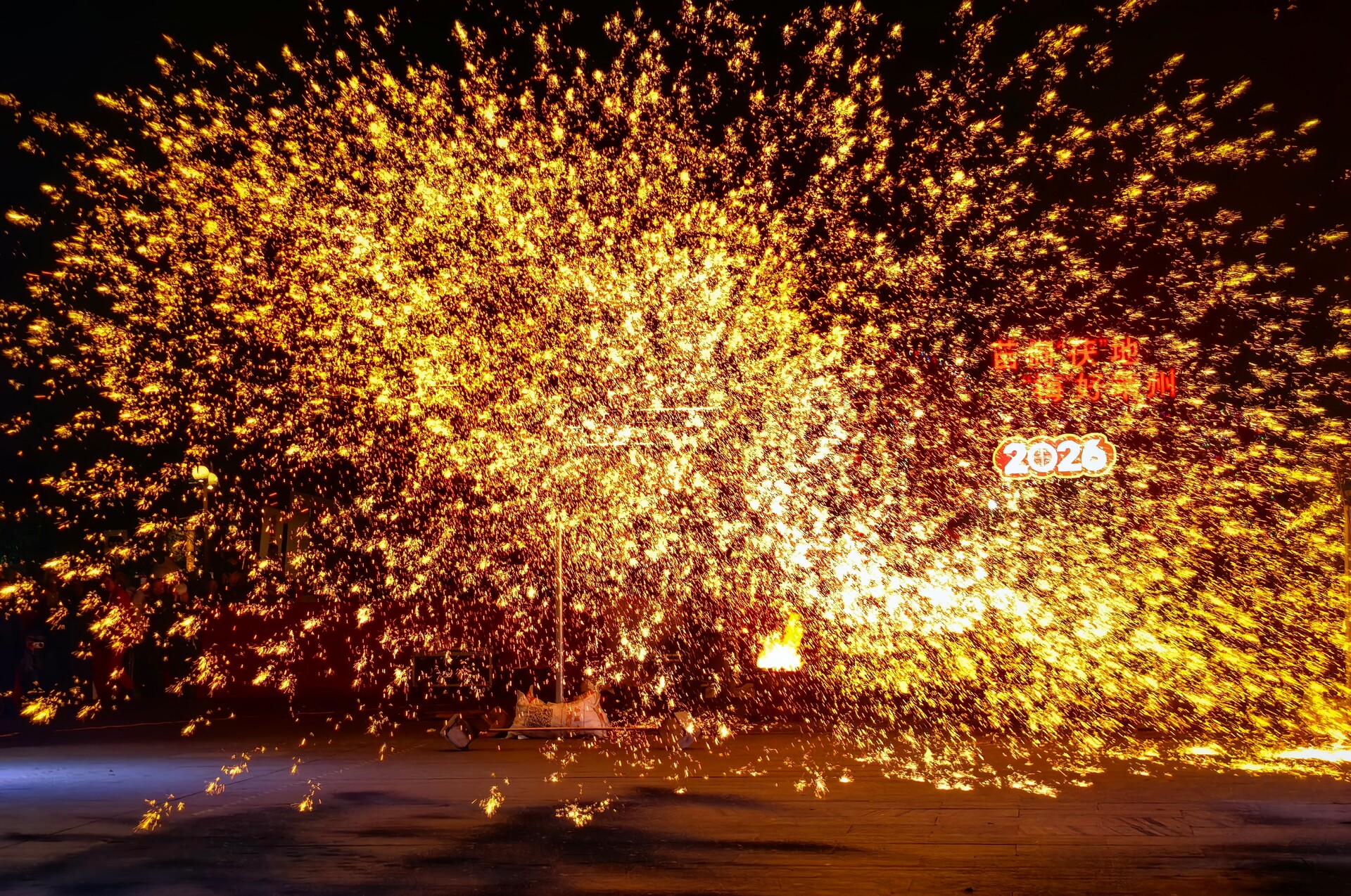 火壶、风火轮碳花舞轮番上演,表演者手持火具灵活舞动,火焰流转、火星飞溅,尽显非遗火技的独特韵味,将现场氛围持续点燃。压轴登场的非遗打铁花表演,更是将活动推向最高潮。表演者将高温熔化的铁水奋力击向空中,滚烫铁水遇冷化作漫天金芒,火树银花凌空绽放,视觉冲击力拉满,与火壶、风火轮碳花舞交相辉映,成为整场活动的核心亮点,让观众近距离感受非遗传统技艺的独特魅力与深厚文化价值。