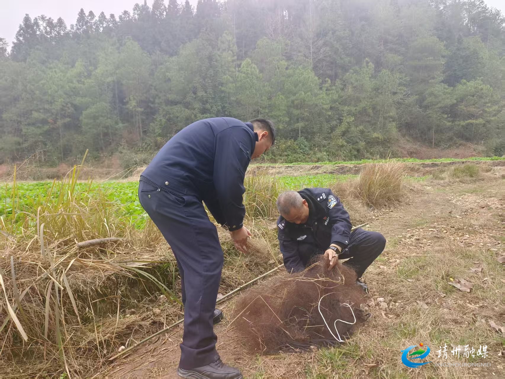 在新厂镇和平村附近农田区域,执法人员发现并拆除2张隐蔽设置的非法捕鸟网,现场查获的捕鸟网已造成野生鸟类伤亡。执法人员现场对涉事村民开展野生动物保护普法教育,引导其树立生态保护意识。