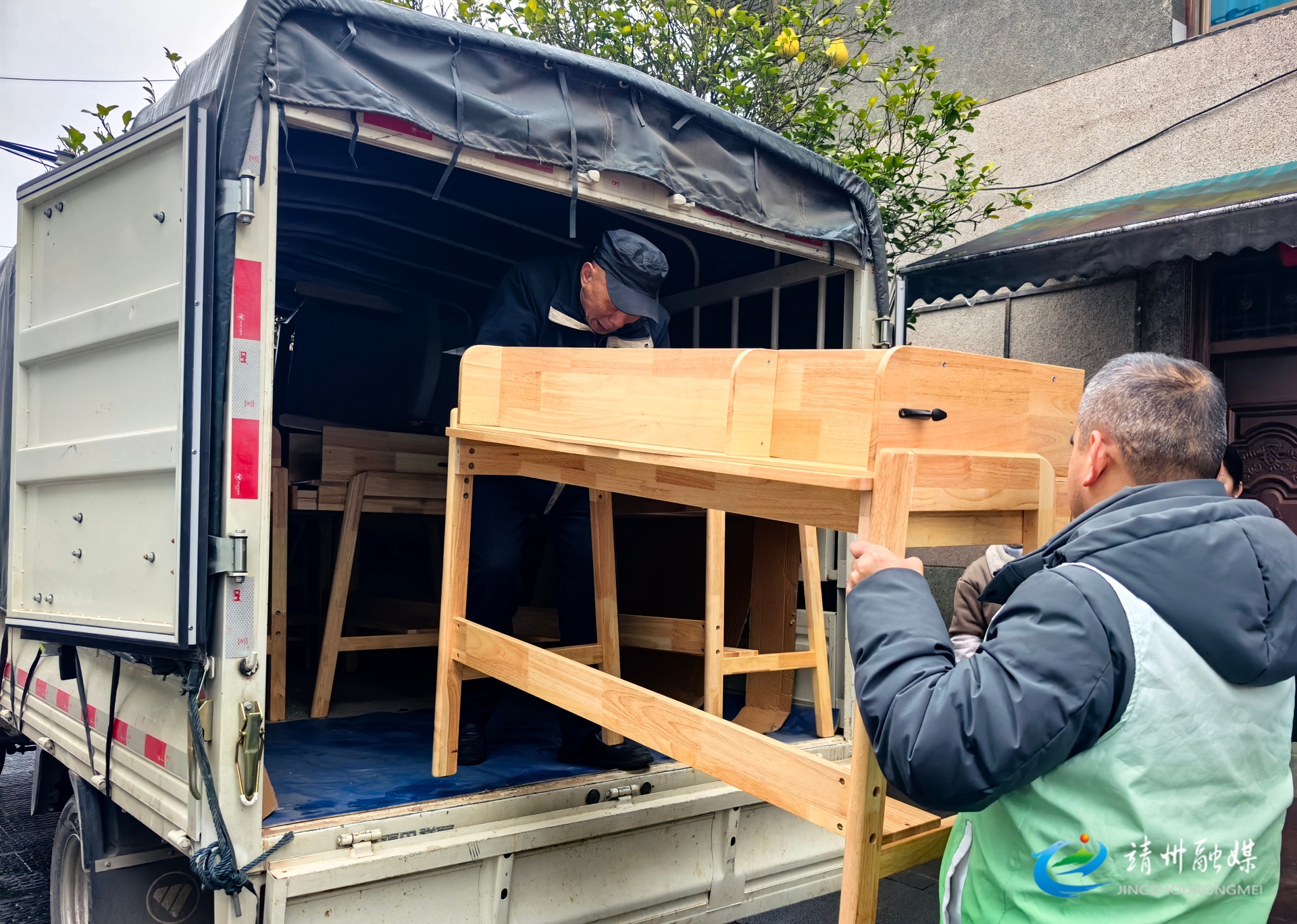 随后,工作人员将桌椅有序堆叠搬上货车,送往各困难学子家中,并现场调试座椅升降功能,适配孩子日常使用需求。