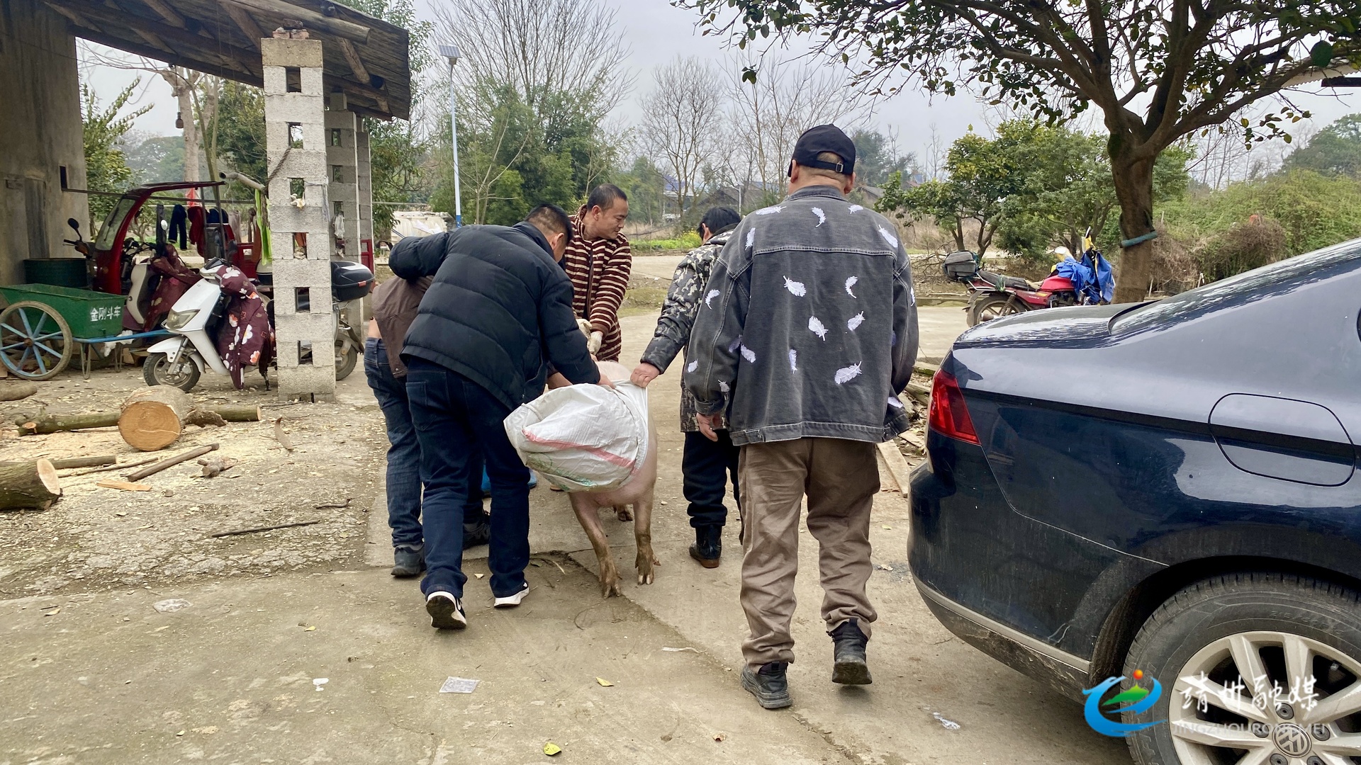 乡亲们合力将年猪引出(张秦 摄)
