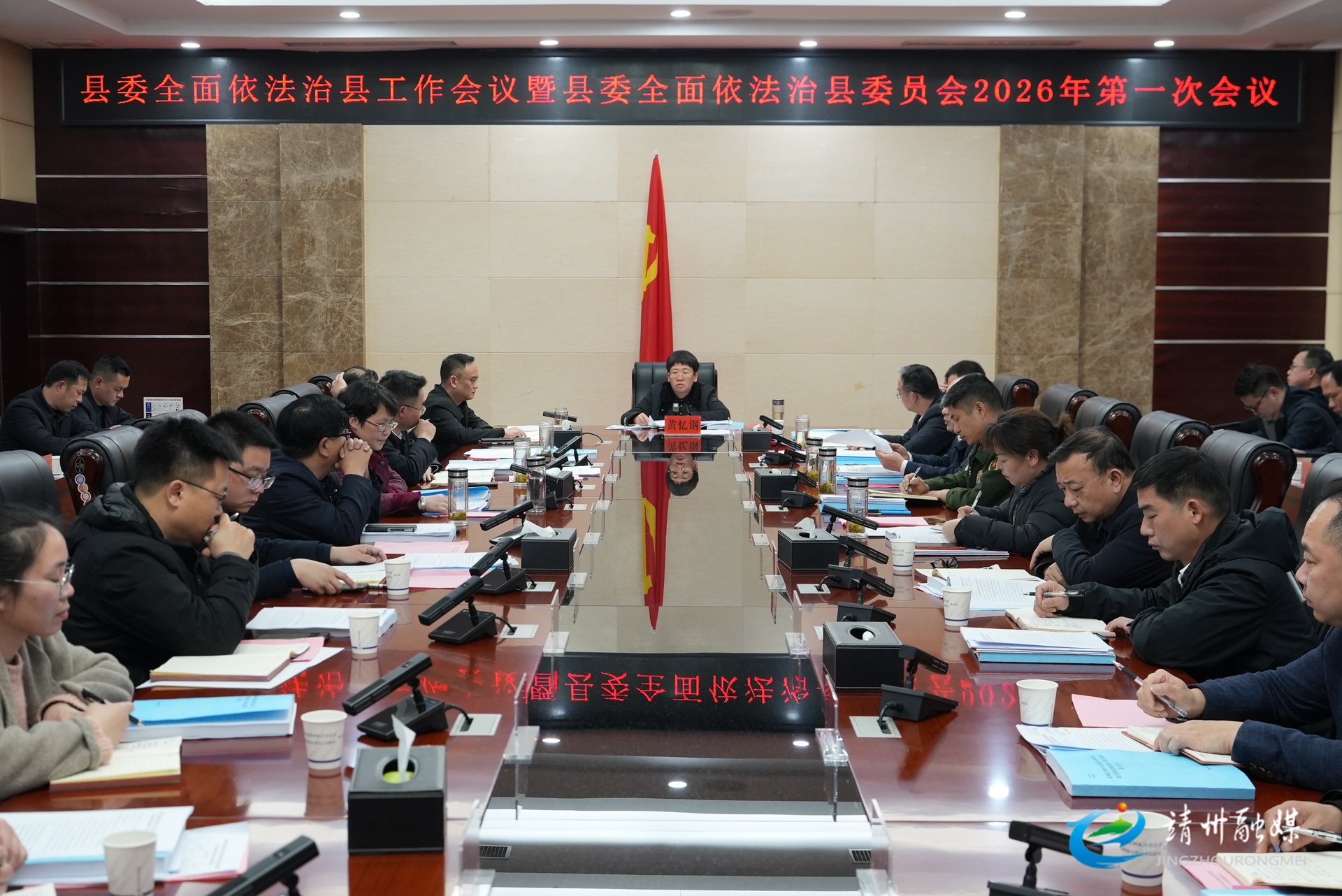 靖州融媒3月19日讯(记者 胡耀文 钦苏芬)3月19日,靖州苗族侗族自治县委书记、县委全面依法治县委员会主任黄忆钢主持召开县委全面依法治县工作会议暨县委全面依法治县委员会2026年第一次会议,深入学习贯彻习近平法治思想,贯彻落实中央、省委、市委有关会议和文件精神,听取有关情况汇报,审议相关文件,开展年度述法评议,安排部署下阶段全面依法治县工作。县委副书记、县长、县委全面依法治县委员会副主任张艳阳出席。