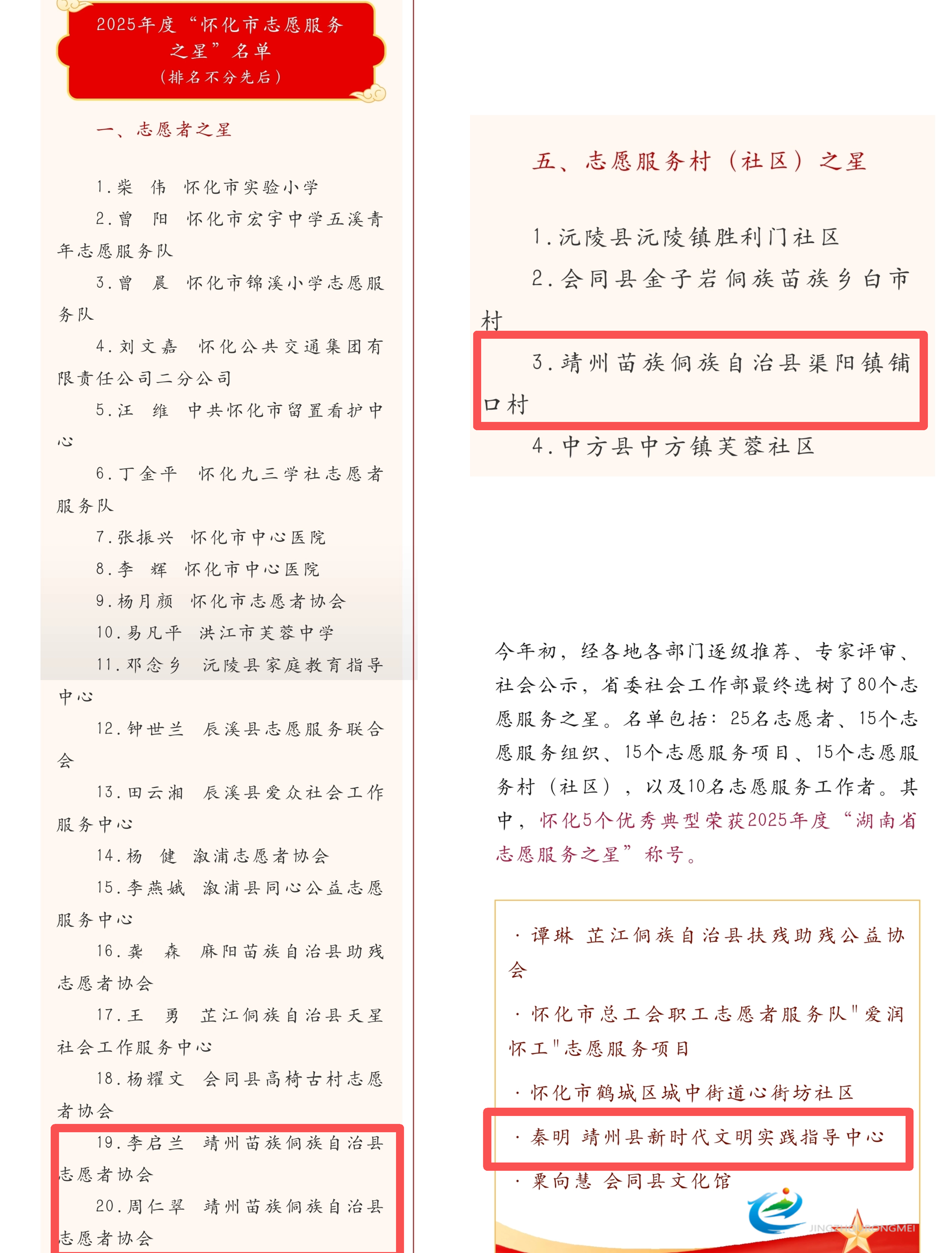 秦明获评湖南省志愿服务工作者之星,李启兰、周仁翠荣获怀化市志愿服务之星,渠阳镇铺口村获评怀化市志愿服务村(社区)之星(资料图)
