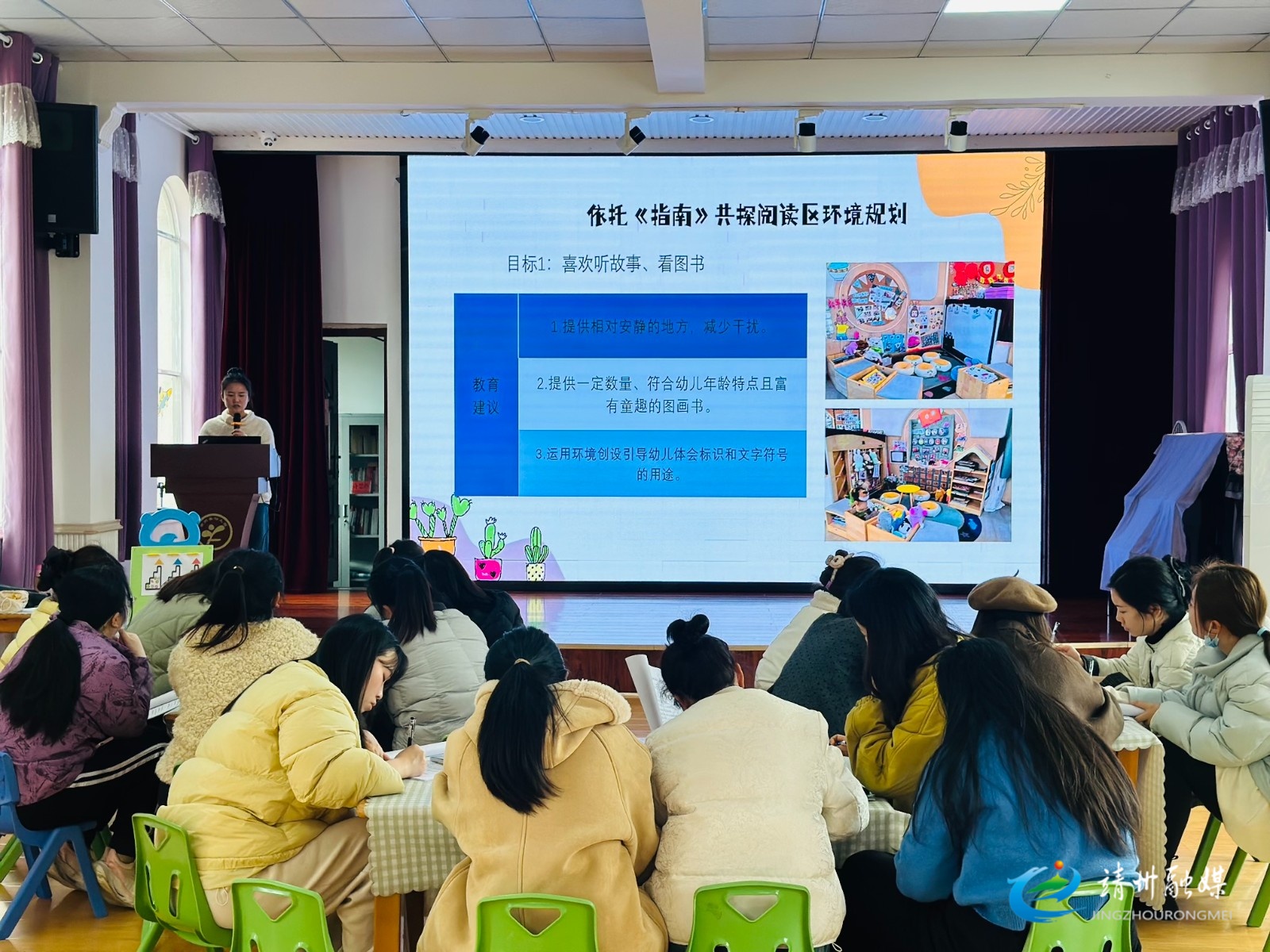 活动最后,副园长历卓尔结合《指南》,系统讲解了阅读区环境规划的核心要素及不同年龄段创设重点,为教师后续工作提供专业指引。