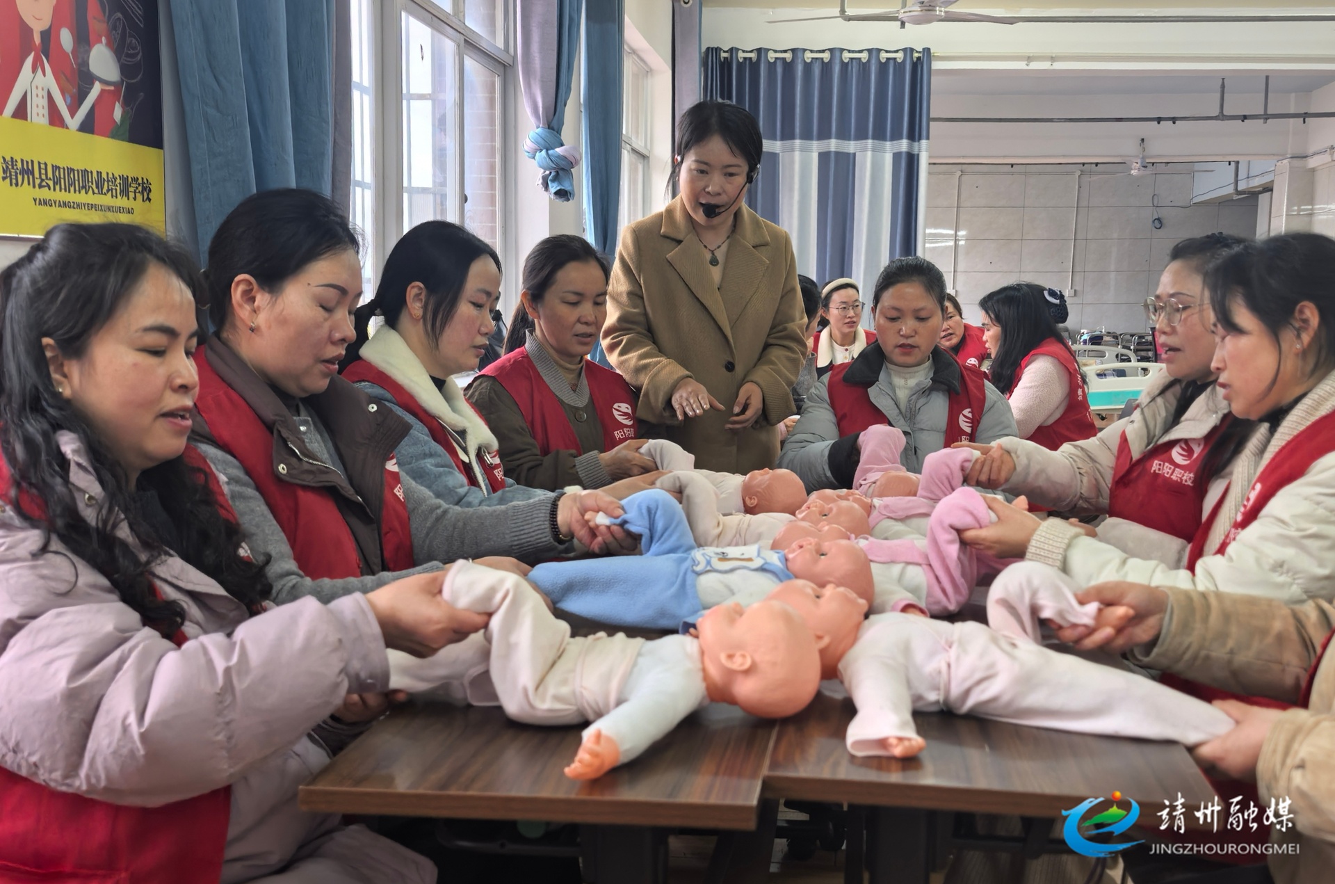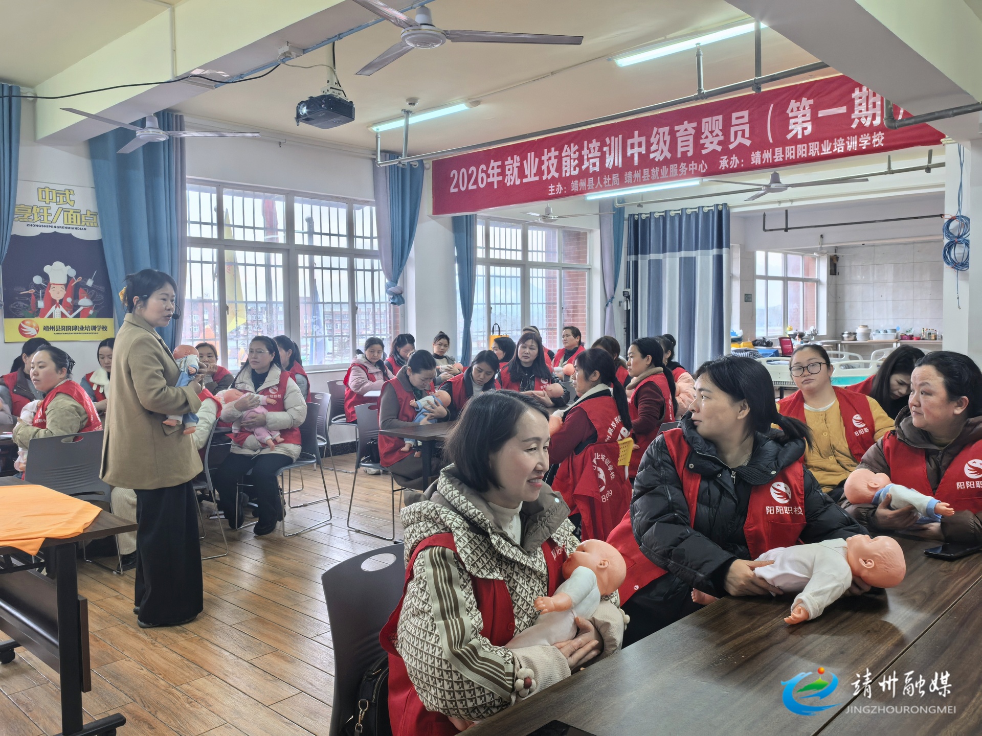 靖州融媒3月26日讯(记者 周悦伊 通讯员 申楠玲)3月26日,靖州苗族侗族自治县阳阳职业培训学校内学习氛围浓厚,由县妇女联合会、县人力资源和社会保障局、县就业服务中心联合主办的2026年就业技能培训中级育婴员(第一期)正在火热进行中。50名学员正在讲师的指导下,借助婴儿模型反复练习抱姿、抚触、喂养等实操技能。