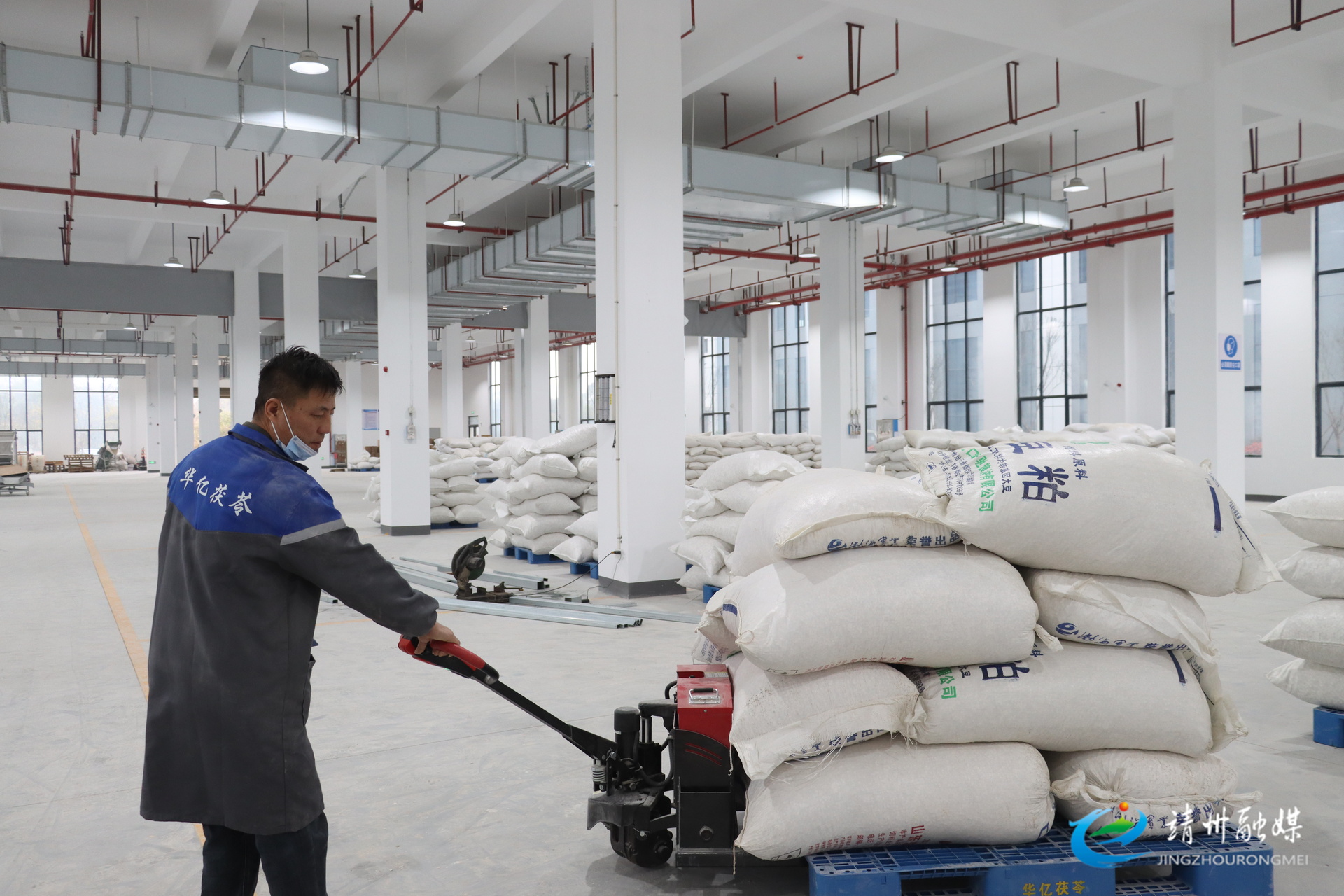 靖州华亿茯苓科技有限公司工人搬运原料,全力保障订单交付,冲刺一季度“开门红”(许梦娟 摄)