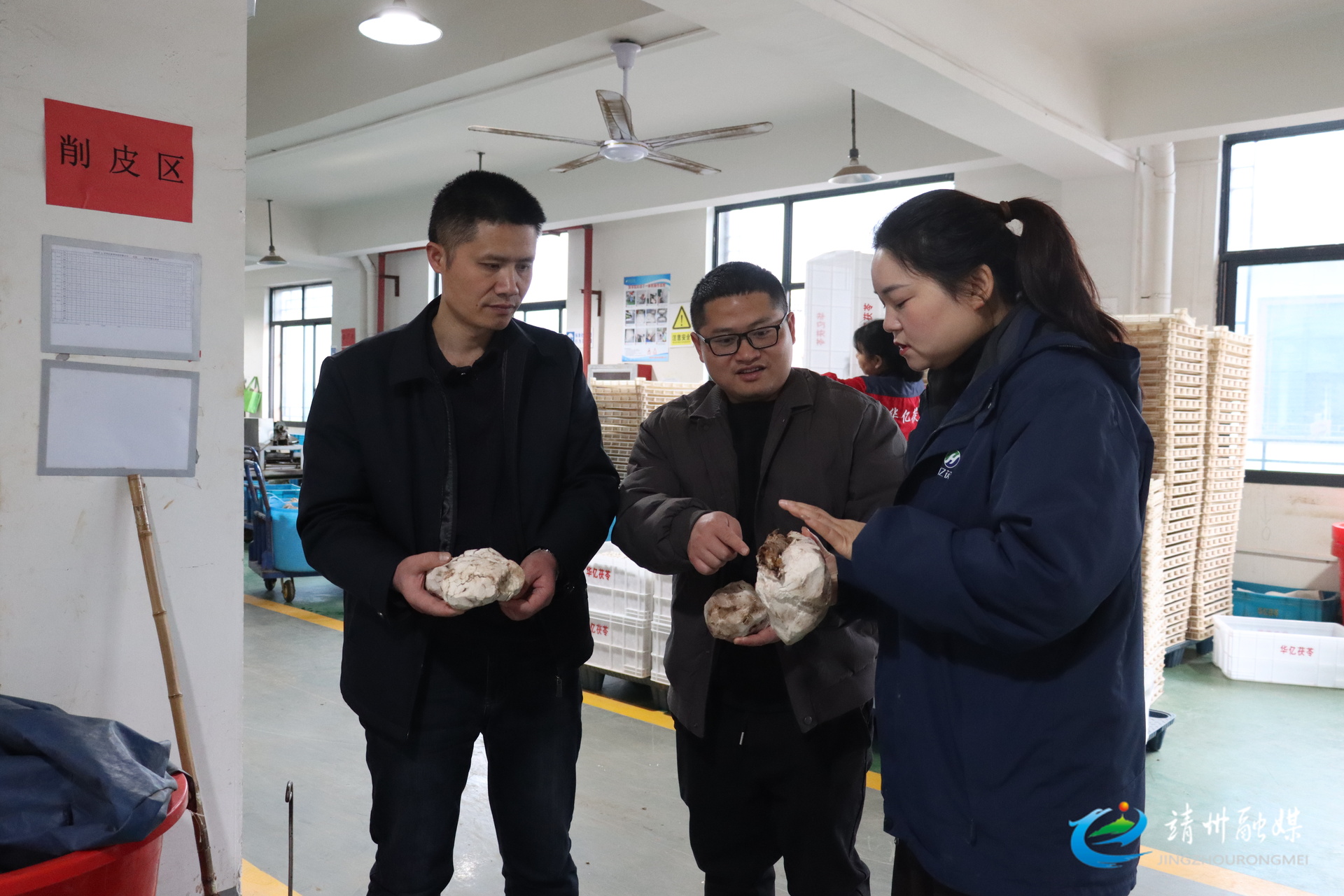 县商务科技和工业信息化局干部下沉企业一线,在茯苓生产车间与企业负责人交流,了解原料品质与生产进度(许梦娟 摄)