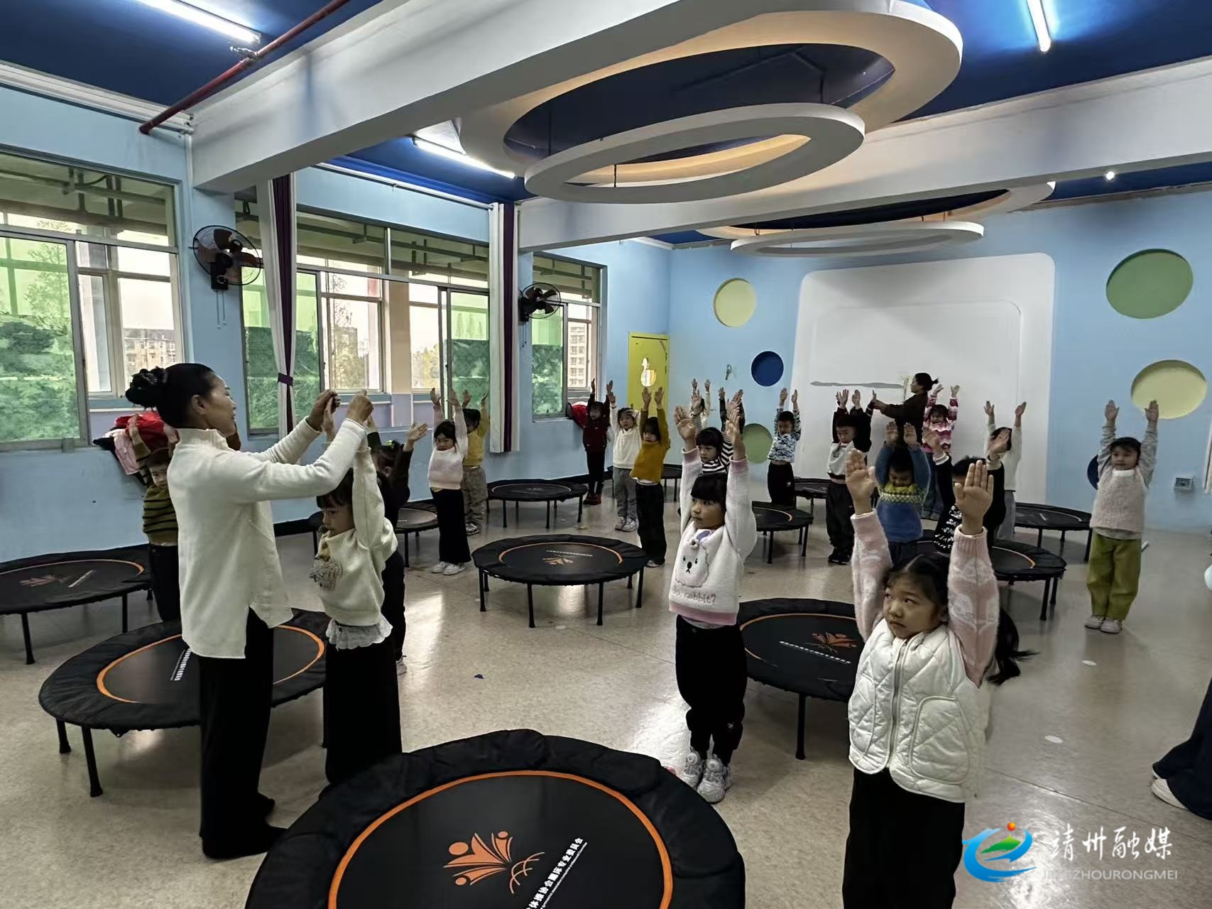 课堂上,教师示范动作要领,指导幼儿规范热身、安全跳跃。幼儿在欢快的音乐中尽情体验运动乐趣。