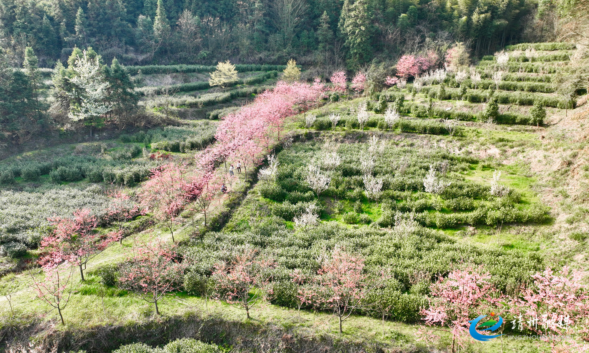放眼山间,连片樱花树依地势错落生长,粉若云霞、白似瑞雪,柔枝轻垂,花瓣在暖阳下晶莹剔透;翠绿茶树沿山体层层铺展,一垄垄如绿浪起伏,芽叶鲜嫩欲滴。粉樱映翠茶,花香与茶香交织漫溢,漫步其间,一步一景皆成诗意画卷。
