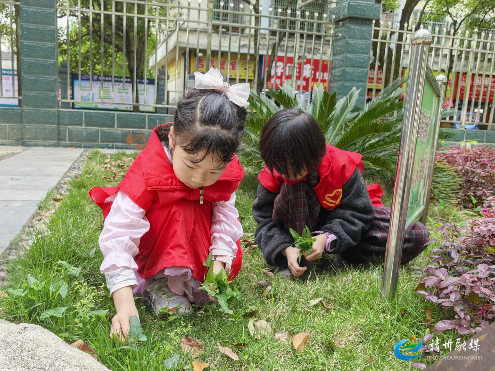 雷锋青少年正在认真拔除杂草(钦苏芬 摄)