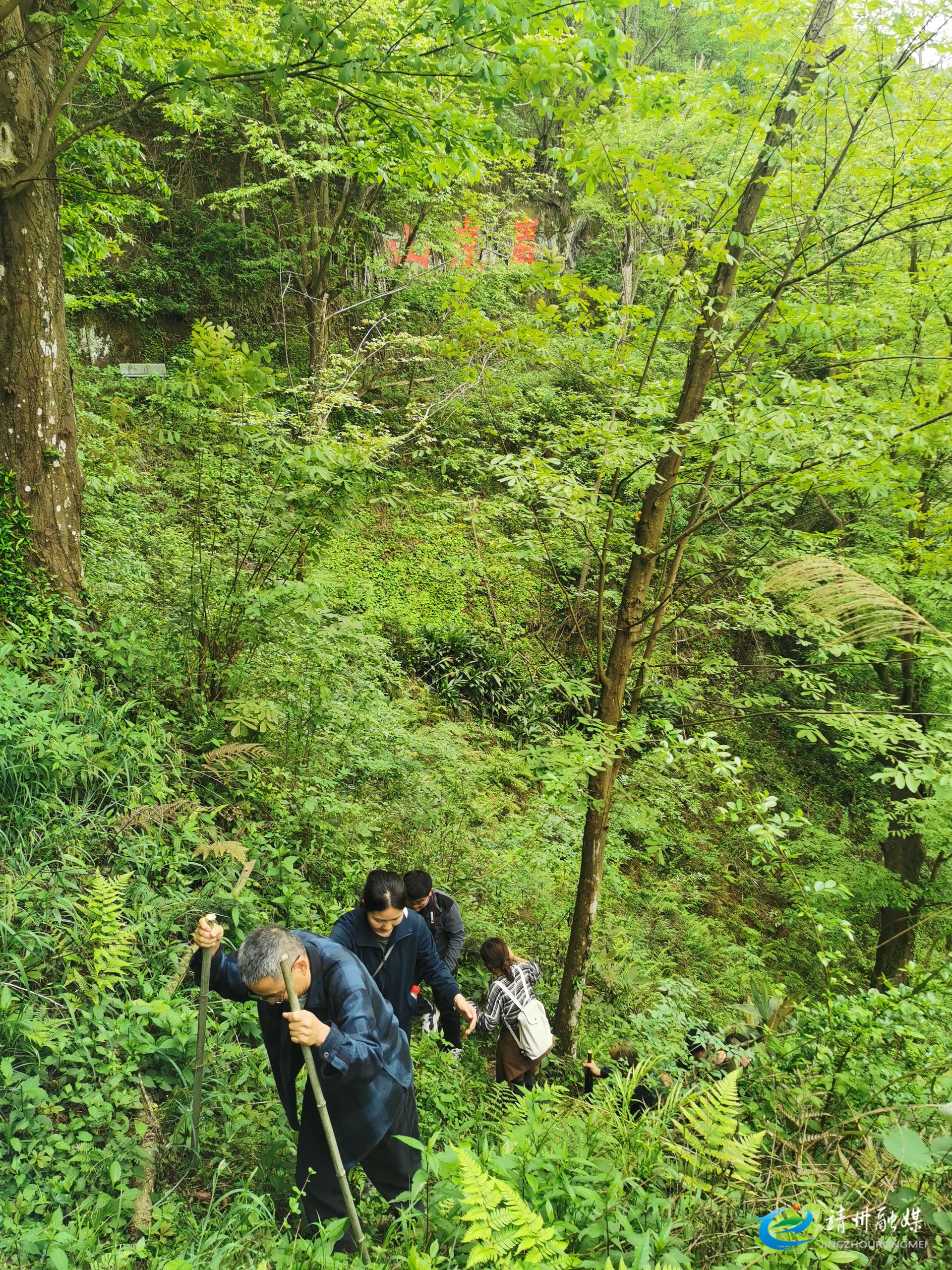 考察组实地踏访岩崖山主峰战场遗址(周悦伊 摄)