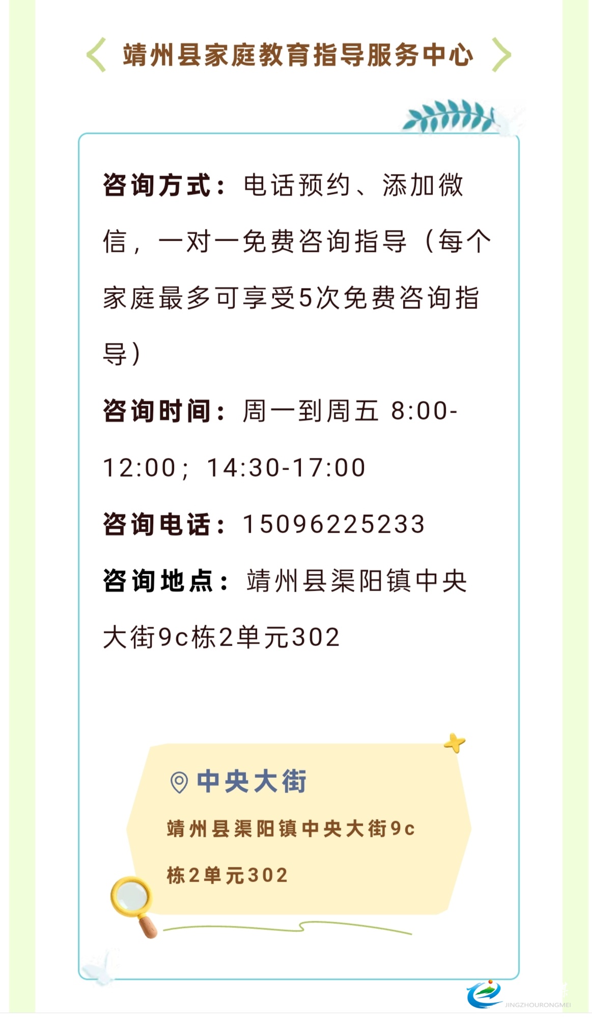 据悉,县妇联家庭教育指导服务中心位于渠阳镇中央大街,采用线上线下相结合的模式,服务时间为每周一至周五上午8:00—12:00、下午14:30—17:00。