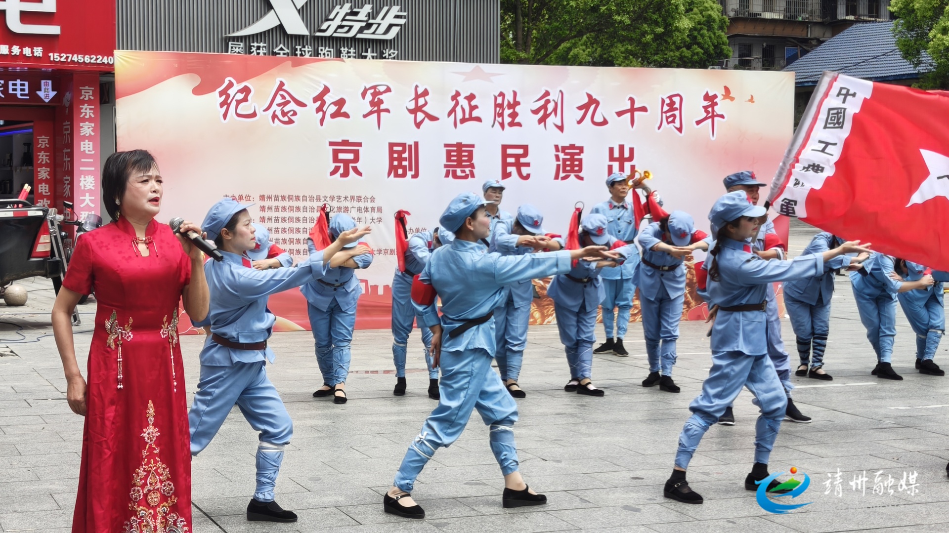 靖州融媒4月17日讯(记者 刘昊)4月17日,靖州苗族侗族自治县纪念红军长征胜利九十周年京剧惠民演出在靖天广场举行,该活动由县文学艺术界联合会、县文化旅游广电体育局共同主办,旨在为群众献上一场兼具思想性与艺术性的红色文化盛宴。