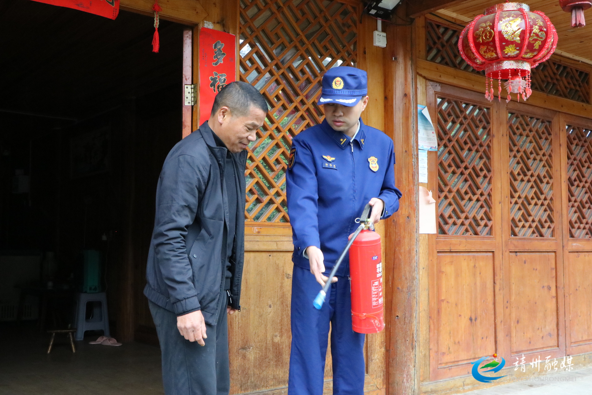 消防监督员教当地村民使用灭火器(夏源懋 摄)