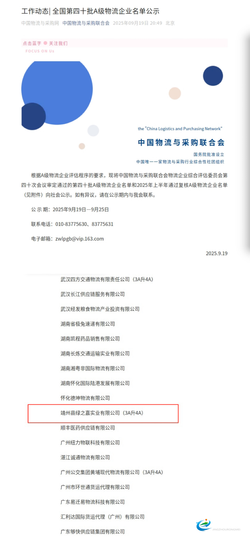 靖州融媒9月22日讯(记者 孙文月)9月19日,中国物流与采购联合会物流企业综合评估委员会第四十次会议审定通过的第四十批A级物流企业名单公布,靖州苗族侗族自治县绿之嘉实业有限公司凭借突出的综合实力,成功上榜全国第四十批A级物流企业公示名单,标志着靖州物流企业发展水平获国家级认可。