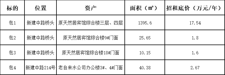 本次招租标的为自来水有限责任公司持有的综合楼以及门面,按区域位置划分为以下4个标的:
