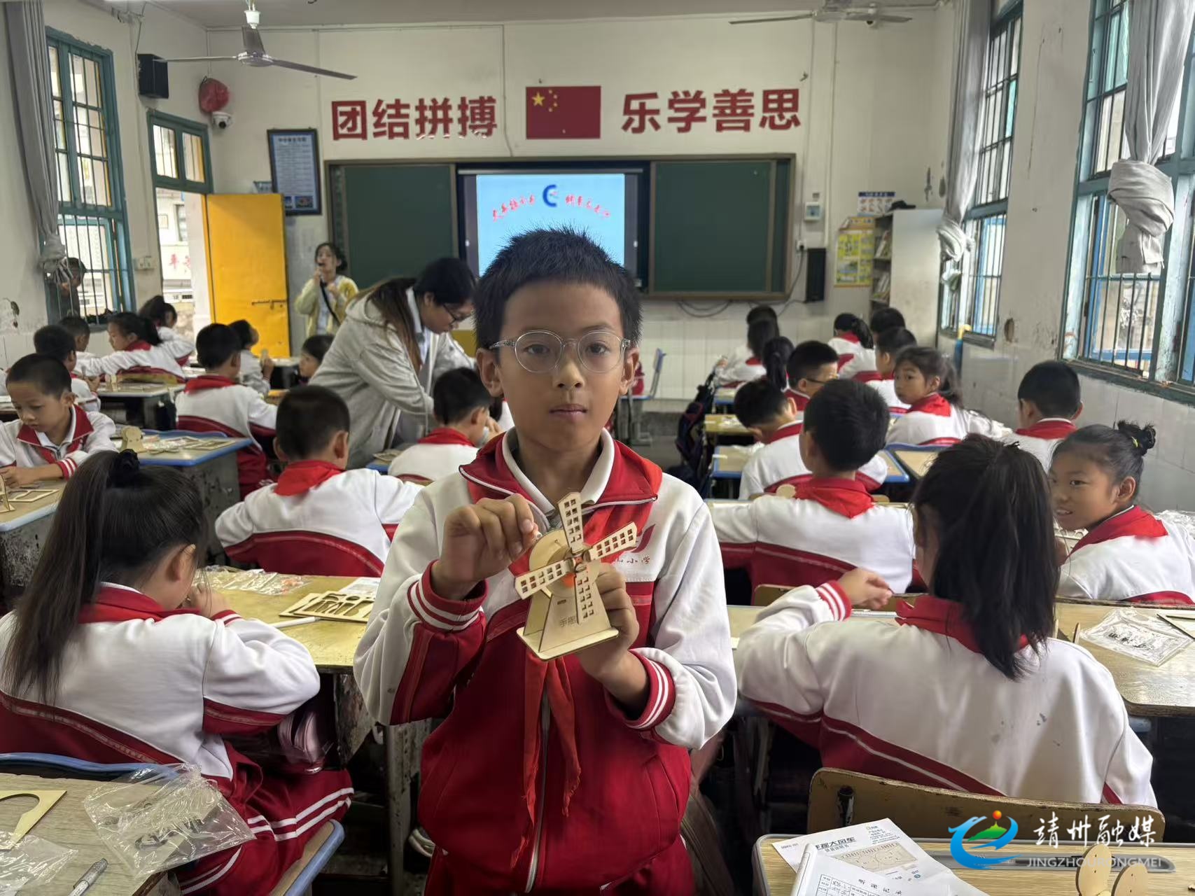 学生展示制作的手摇大风车(刘敏 供图)