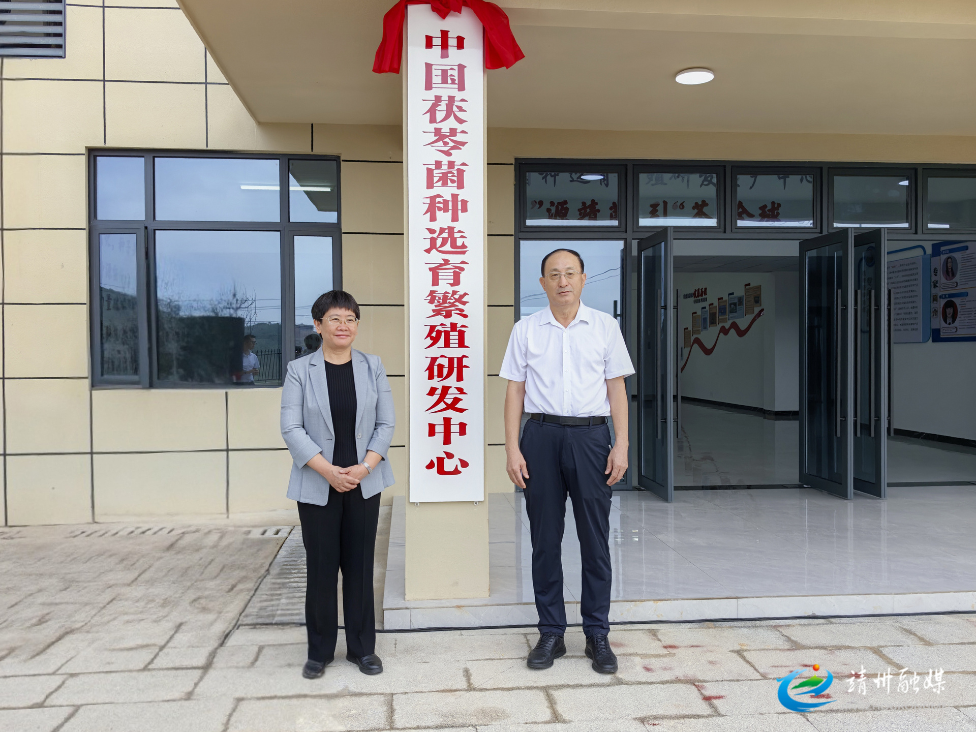 中国菌物学会理事长、中科院研究员郭良栋与县委书记黄忆钢共同为中国茯苓菌种选育繁殖研发中心揭牌(钦苏芬 摄)