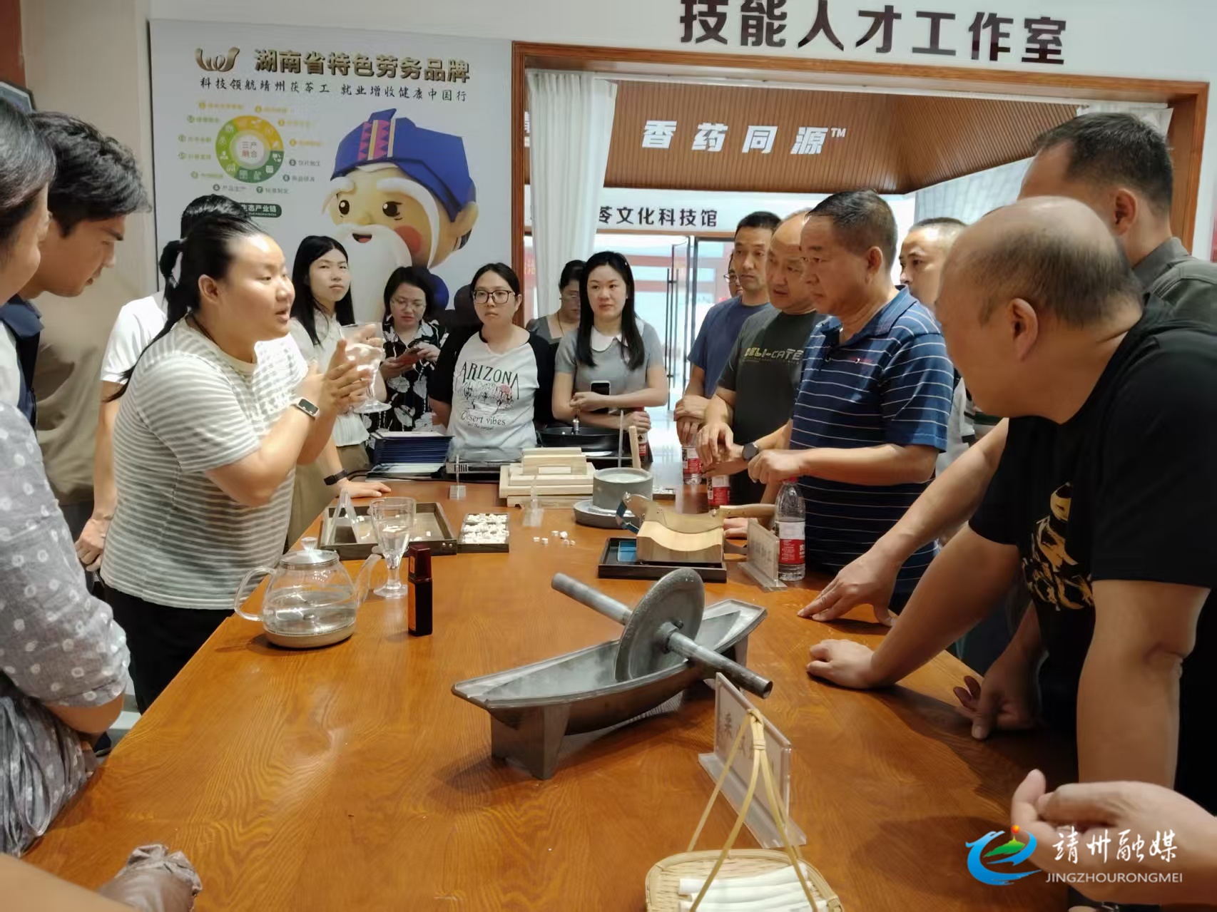 在茯苓加工贸易中心,学员们紧随讲解员了解靖州茯苓产业从选育菌种到茯苓深加工产品,再到制定ISO国际标准的进阶之路。展厅内,琳琅满目的茯苓制品直观呈现产业多元价值,茯苓真假鉴别现场演示干货满满,“香药同源”的靖州茯苓文化浸润人心,大家沉浸式感受特色产业的发展活力。