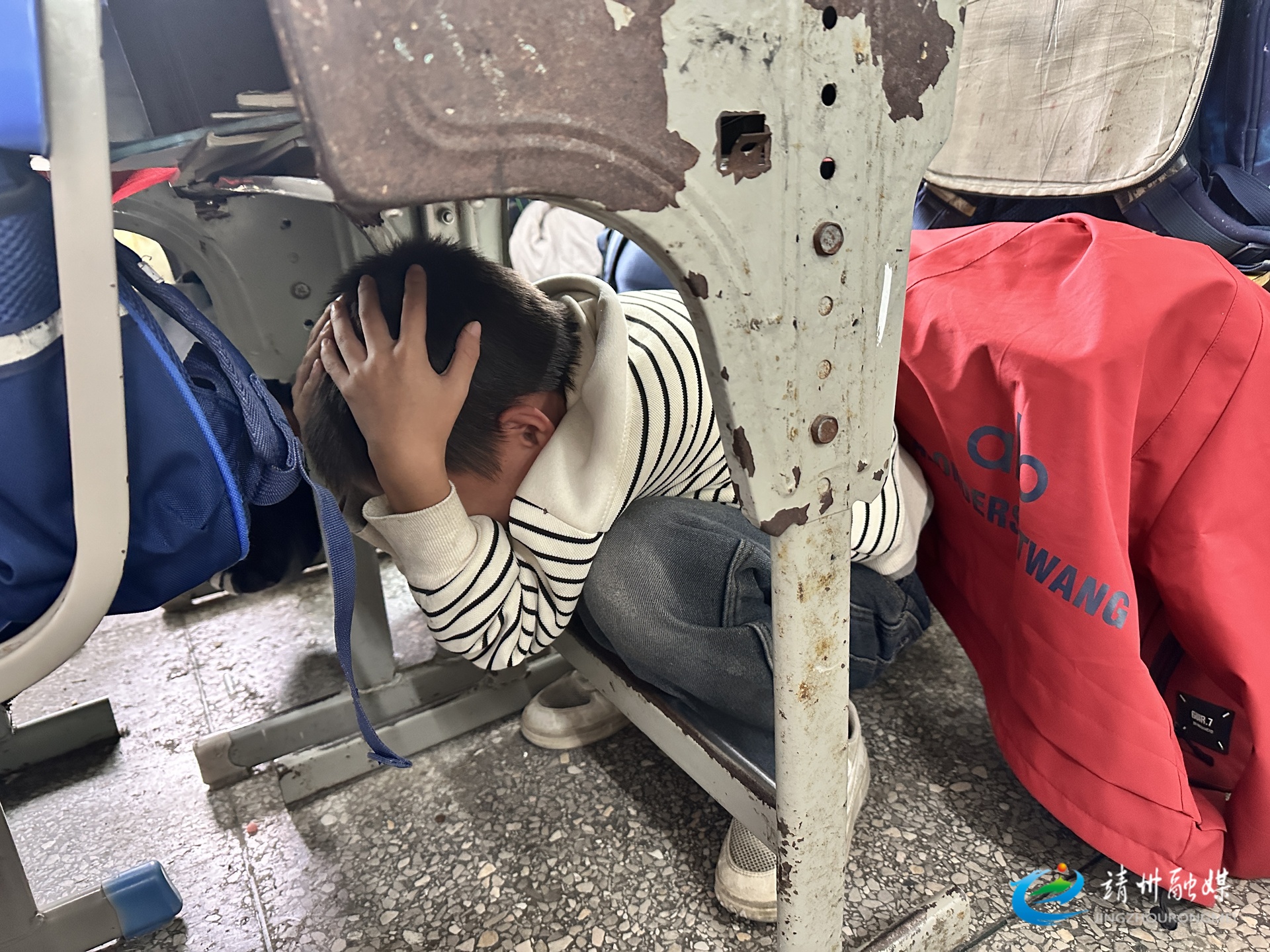 预警信号响起后,孩子们迅速抱头蜷身躲避于课桌下(杨荔 摄)