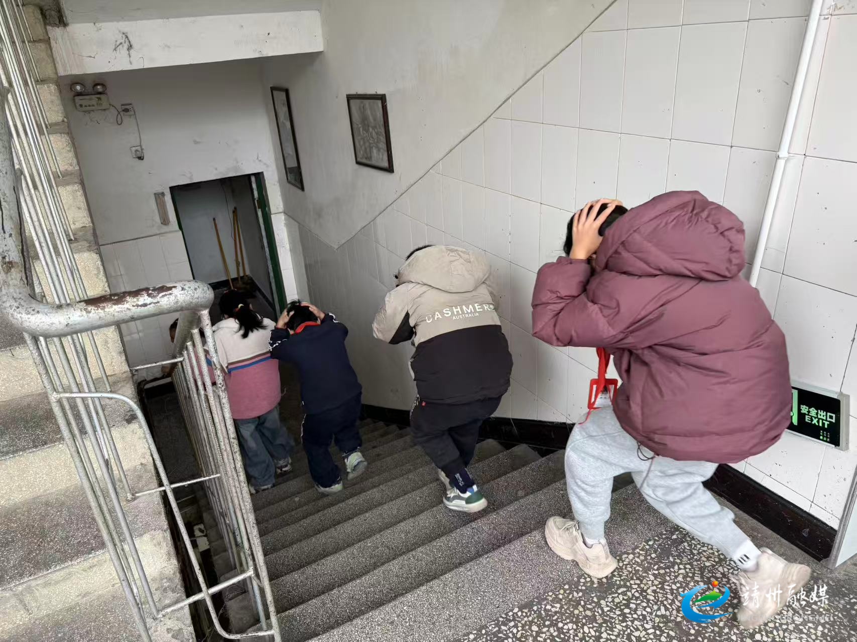 学生们弯腰低姿,按预定路线有序撤离(杨荔 摄)