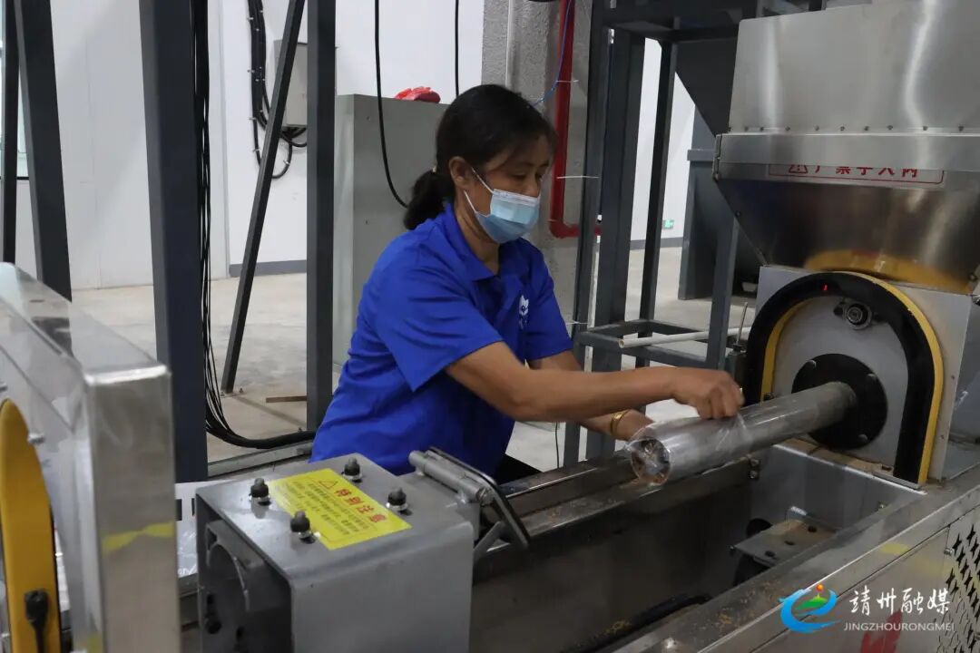 工人使用数控装袋机制作茯苓菌种(许梦娟 摄)