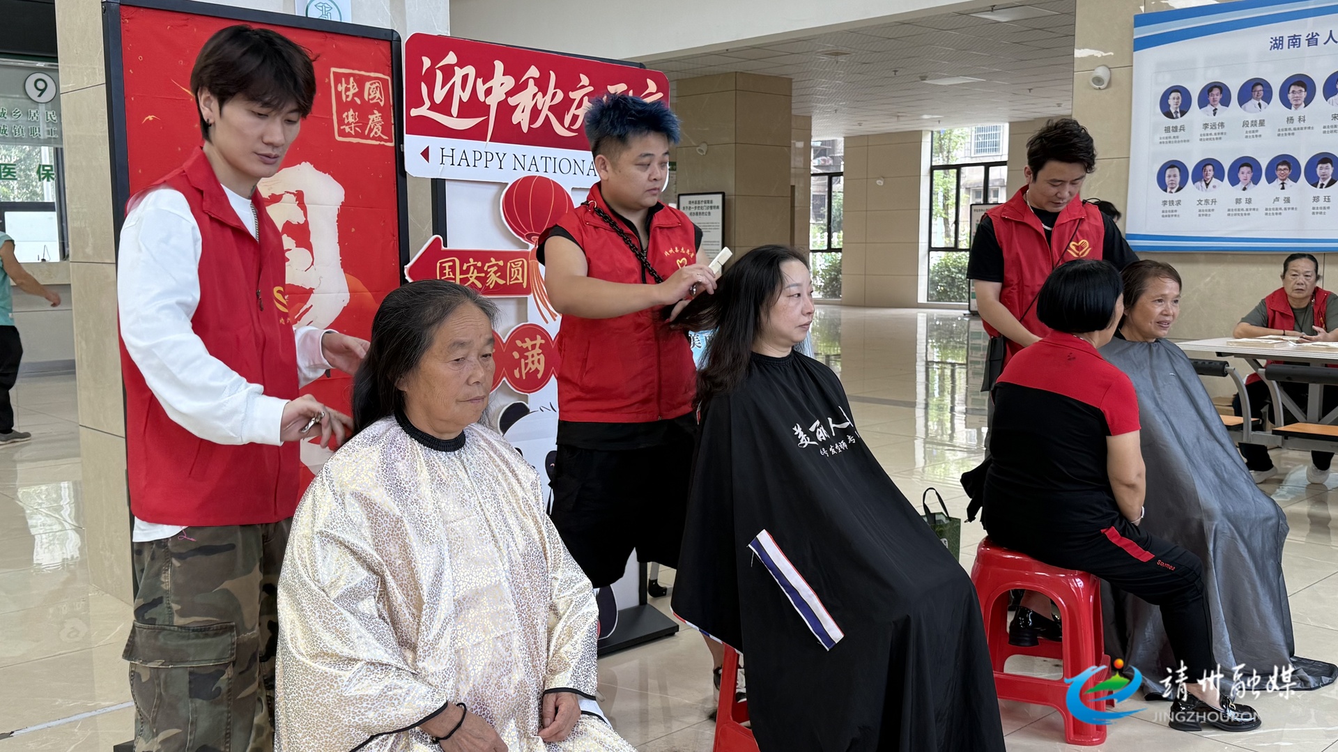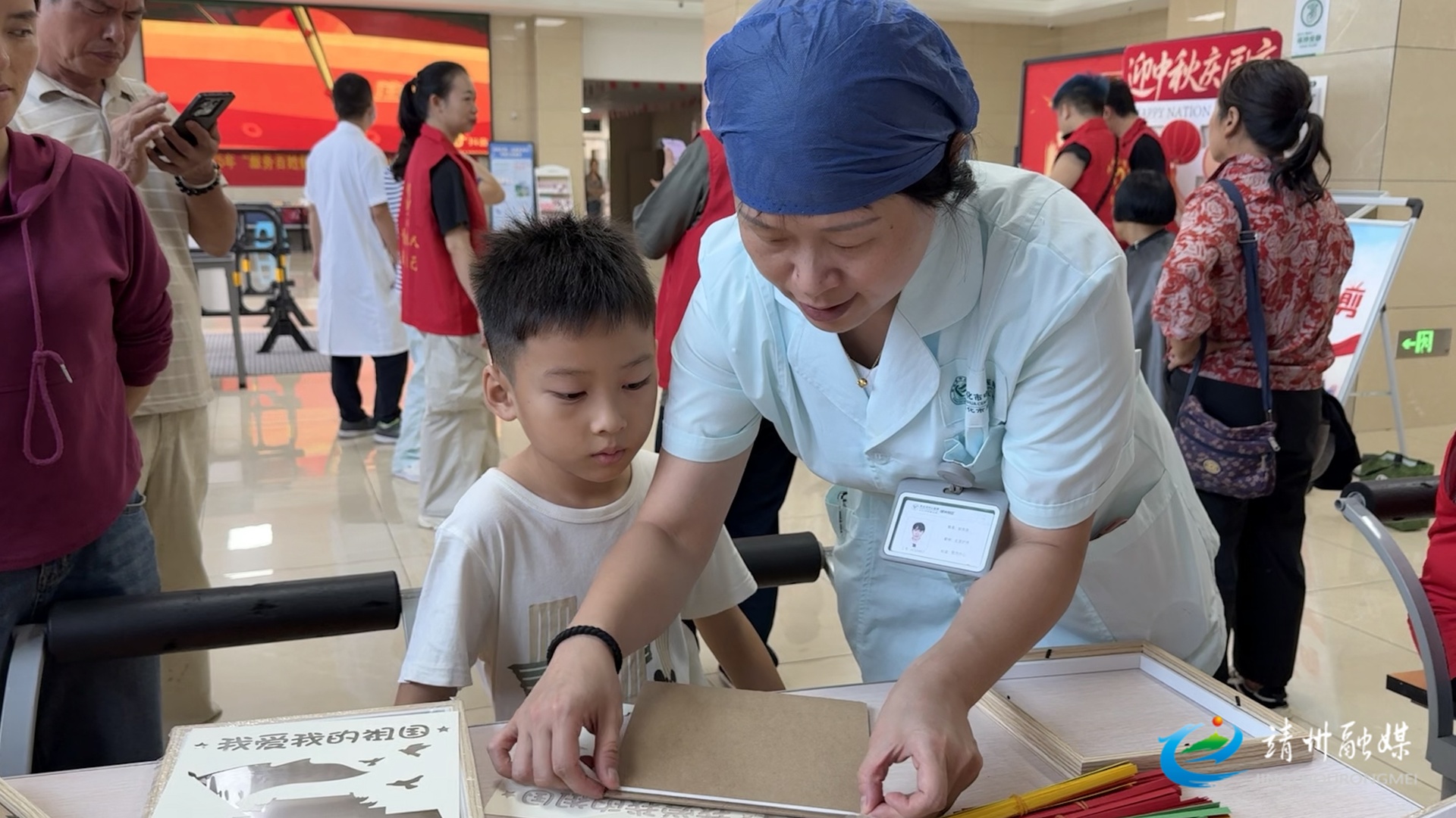 在该院新住院大楼一楼大厅,祈福签到区的红色展板前,市民们纷纷写下祝愿祖国繁荣昌盛的美好祝福和家人平安健康的真挚心愿;非遗竹编画区域则陈列着“祖国在心中”“中秋玉兔”“圆月”等纹样的样品,市民在医护人员指导下,动手制作非遗竹编画;在公益义剪区,理发师们动作娴熟又细致,剪刀在手中飞舞,为市民精心打造着新的发型。