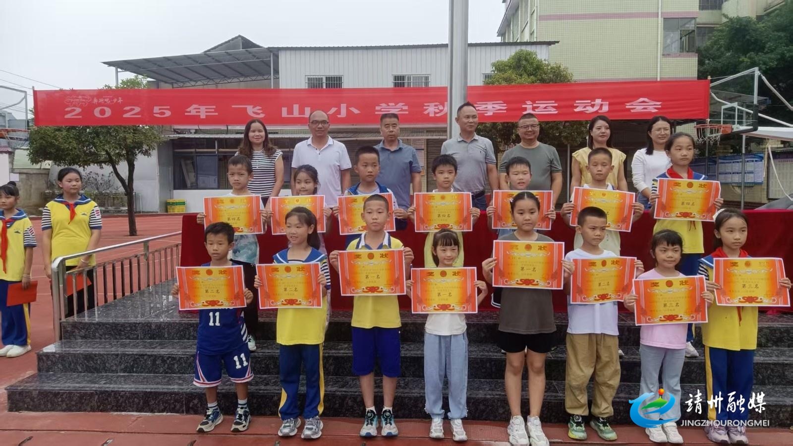 在飞山小学,跑道上运动员奋力冲刺展风采,田赛区跳高、跳远选手挑战自我创佳绩;赛场外,啦啦队加油声不绝于耳。闭幕式环节,校领导为团体总分前六名的班级颁奖,现场掌声阵阵。