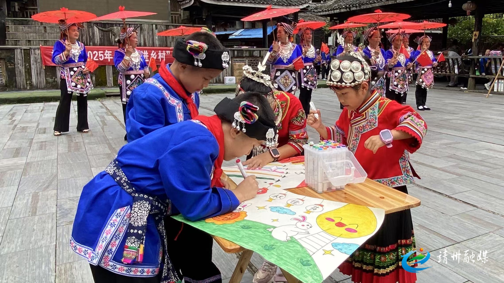 歌舞表演节目中孩子们现场绘画(张秦 摄)