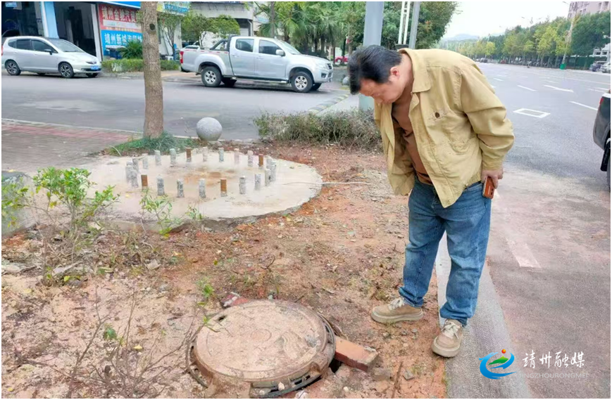 工作人员巡查、处理破损井盖(阳辉 供图)