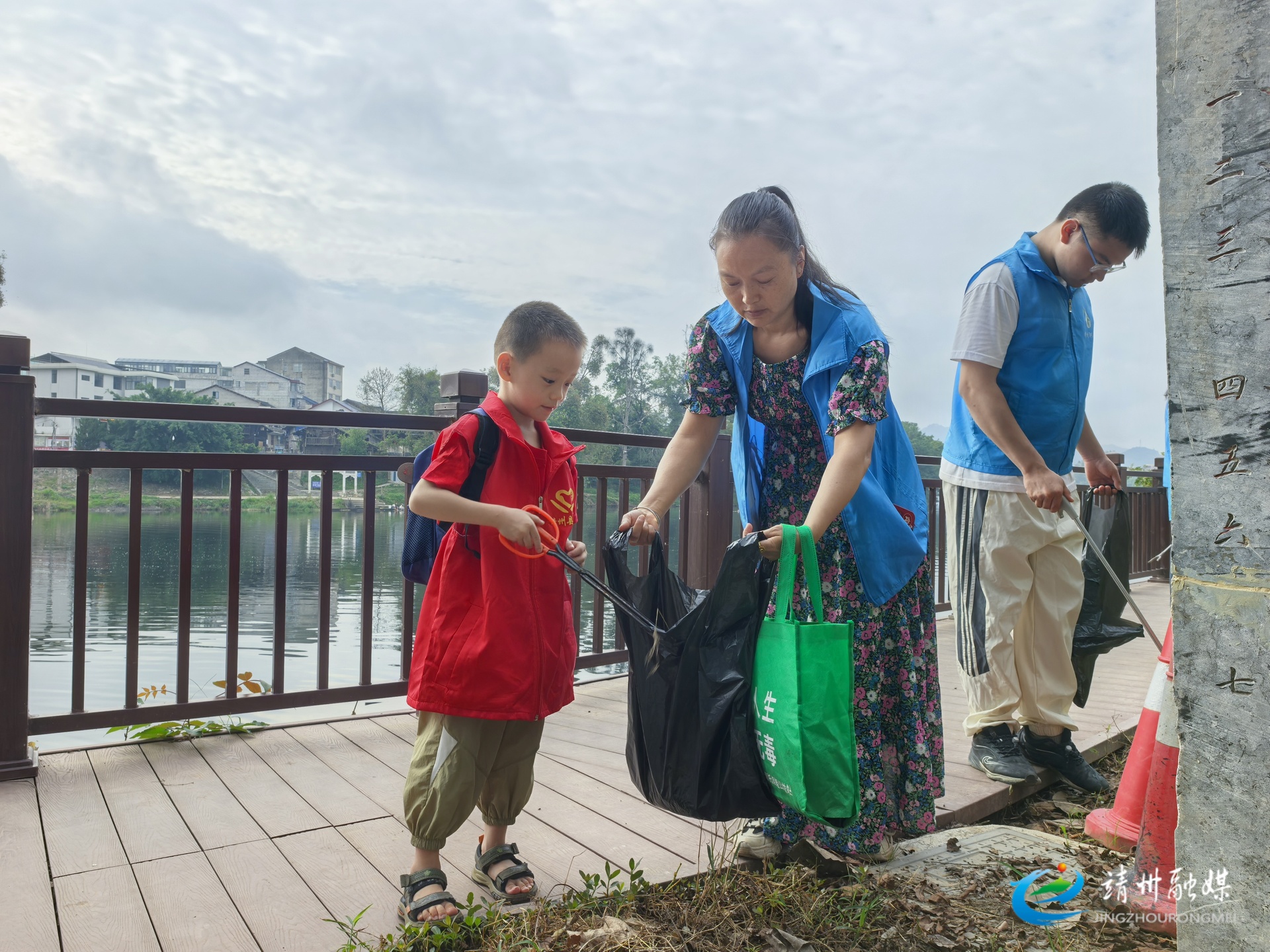 河岸上,志愿者带领小朋友沿河岸行动,大家手持垃圾袋弯腰捡拾塑料瓶、烟头等沿岸垃圾,同时向路过居民及沿岸住户普及护河知识。随后,志愿者还结合生动案例向小朋友讲解垃圾入河对水生生物的危害,让环保理念深植童心。