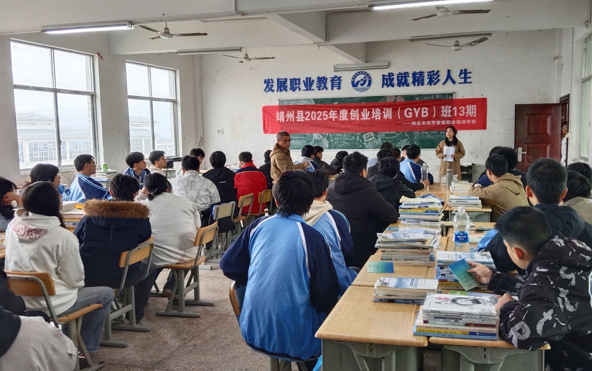 培训课上,来自怀化市汉华智兴职业培训学校的多名讲师以案例解析、互动研讨的形式,引导学生结合自身兴趣与市场需求挖掘创业思路。培训以“系统生成可行企业想法、精准筛选适配创业方向”为核心目标,从安全生产、消防安全等职场必备知识导入,到“什么是企业想法”“你适合创业吗”的自我评估,再到企业想法生成、优质项目筛选的方法训练,既兼顾实用基础,又配套SIYB沙盘模拟实操。学生们以小组为单位模拟企业运营,在“沉浸式演练”中直观理解创业逻辑与风险管控。