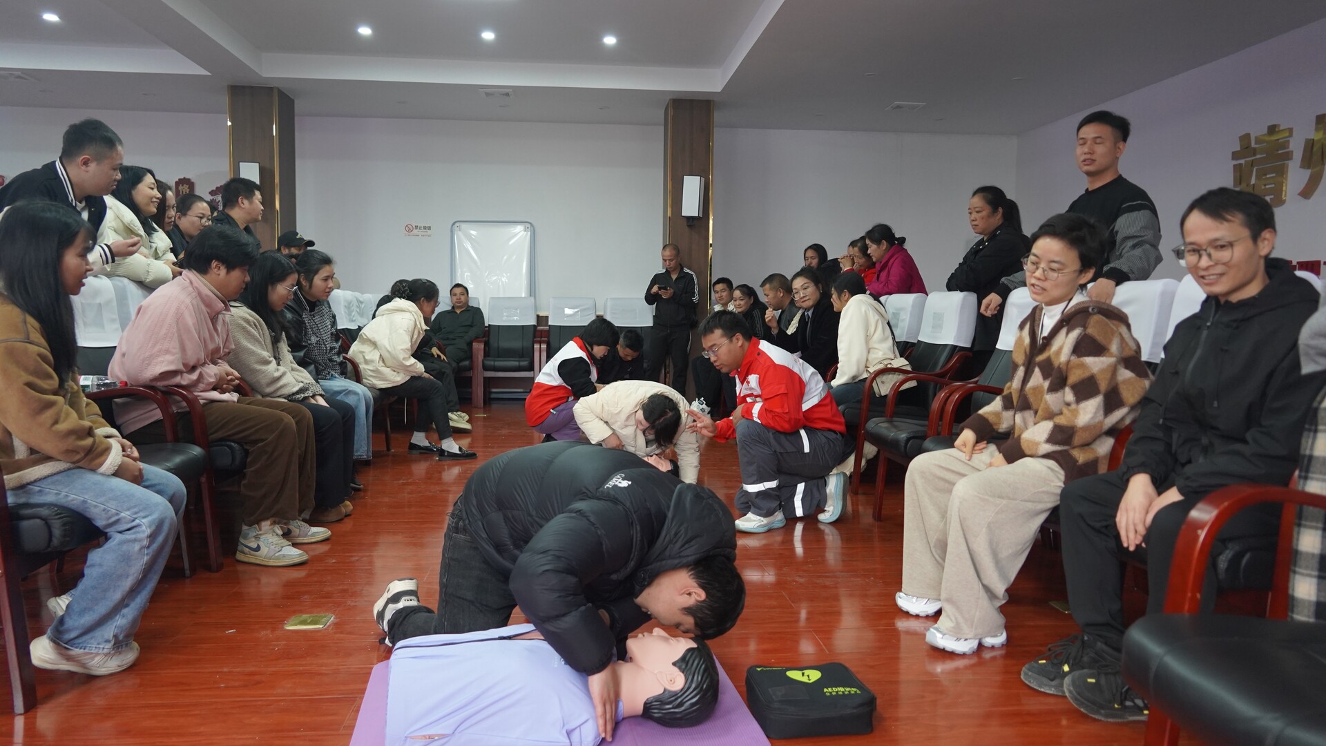 “前方有人晕倒,周围环境安全,已做好自我防护!”实操练习环节,讲师细致演示晕倒判断、胸外按压、AED操作等规范流程,手把手指导关键细节。