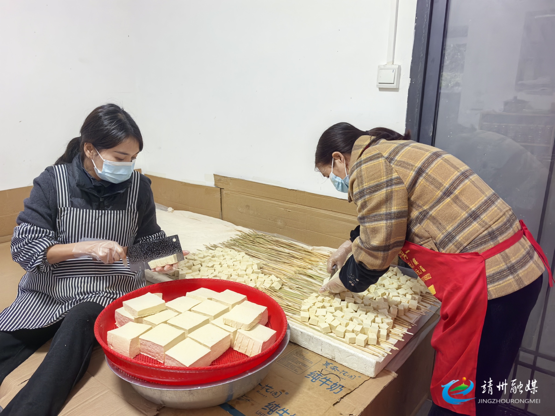 王文婷和她母亲正在把新鲜豆腐切成大小均匀的小坨(钦苏芬 摄)